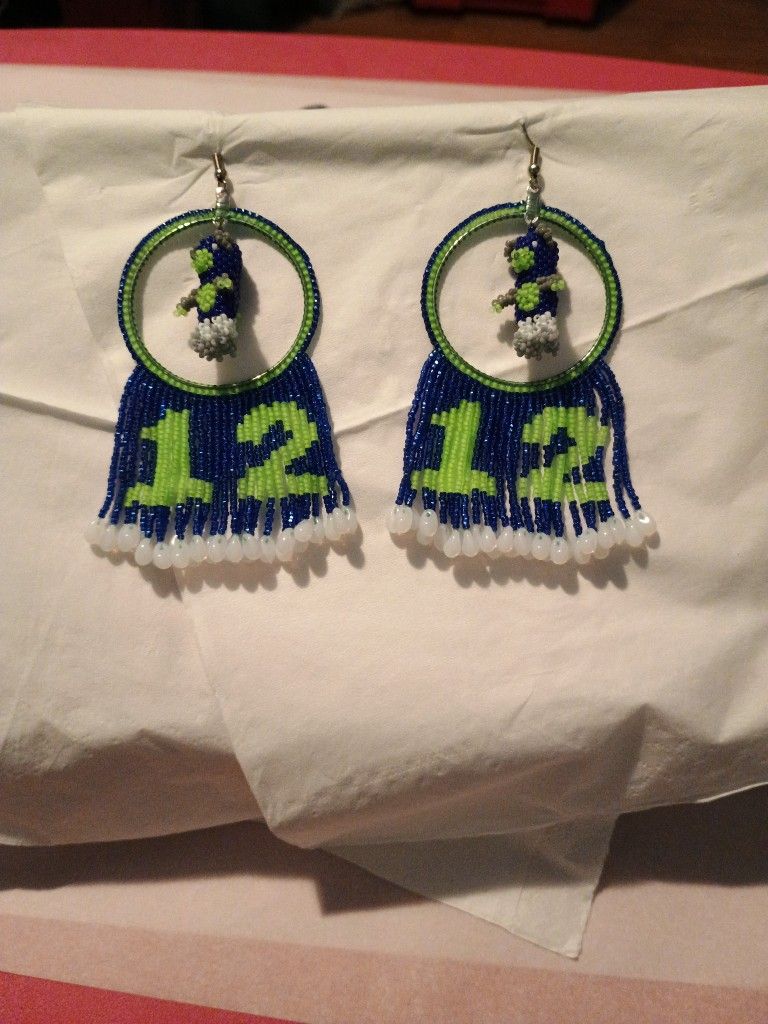 Seattle Seahawk teddy bear hoop earrings with big 12 in dangling fringes. All in Seahawk blue, green and white