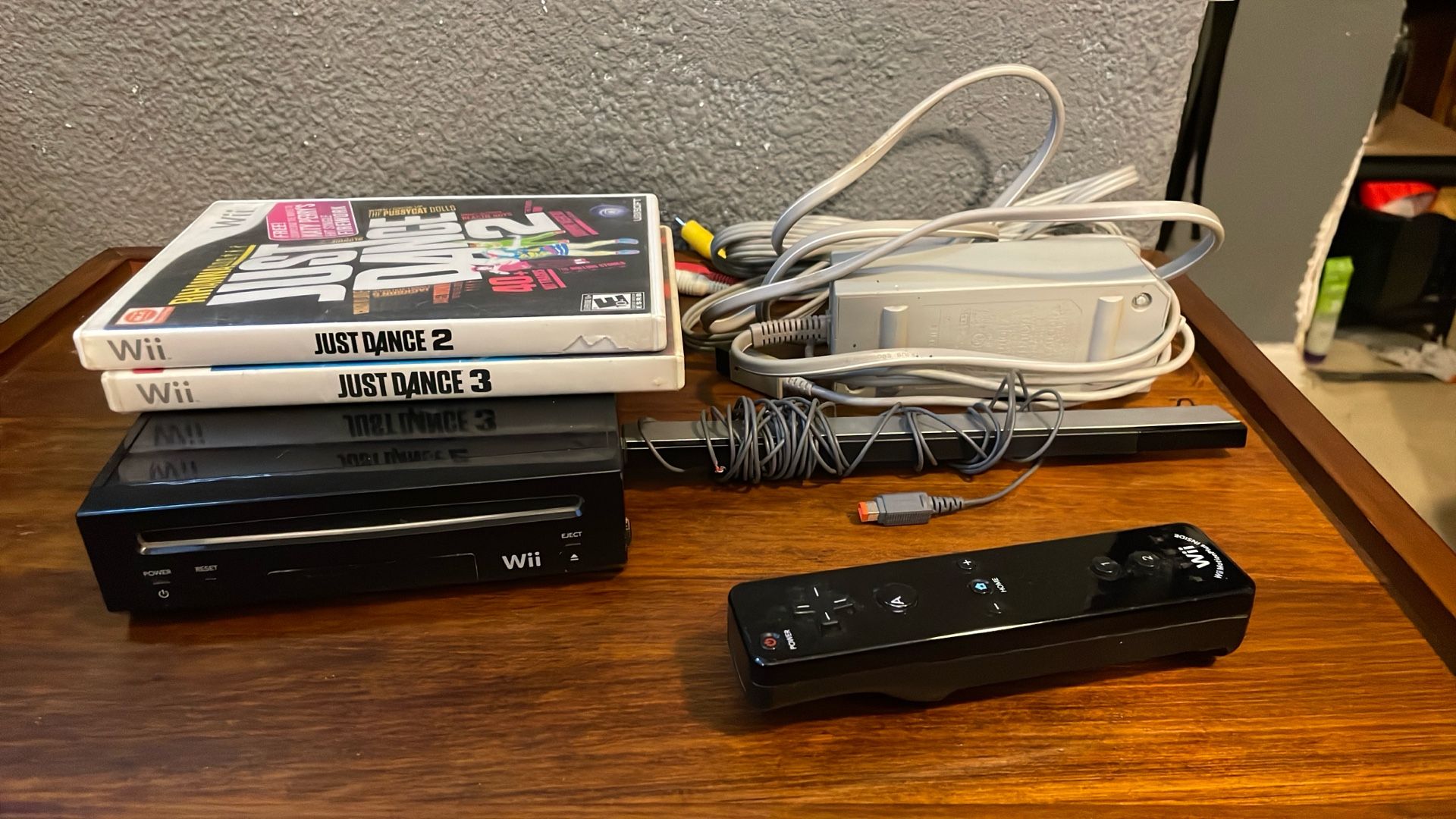 Black Wii has all wires needed to play sensor bar one controller and two just dance games works great