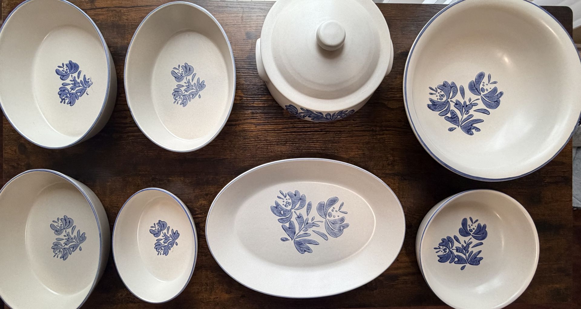 Beautiful vintage blue floral stoneware dinnerware set in a classic farmhouse style. Durable and timeless design with blue floral pattern on cream stoneware. Set includes multiple serving and dining pieces such as: Large serving bowl Covered casserole dish with lid Large serving platter Oval serving dishes Dinner plates Smaller plates / side plates Bowls All pieces are in very good condition with no chips or cracks. Great for everyday use or for someone who loves vintage farmhouse kitchen decor. Perfect for a starter dinnerware set, cottagecore aesthetic, or collectors of vintage stoneware. $100 OBO Pickup in Buffalo.