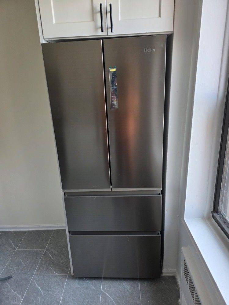 Haier 14.5 Cu. Ft. French Door Bottom Mount Refrigerator (Model: QJS15HYRFS). Brand new unused open box - Local Pick-up Only Exterior Dimensions Overall Height: 69 7/8 inches (to top of hinge) Overall Width: 27 3/4 inches Overall Depth: 26 7/8 inches (includes doors; this model features recessed handles, so the depth without handles is the same) Detailed Depth Measurements Case Depth (without doors): 24 1/4 inches Depth with Doors Open 90°: 38 inches Width with Doors Open 90°: 29 5/8 inches (you’ll need this extra width if the fridge is placed next to a wall to allow the doors to swing open properly) Required Installation Clearances Back: 2 inches (essential for proper airflow and to avoid overheating) Sides: 0 inches (designed for a flush look, though a small gap is often recommended for easier installation)