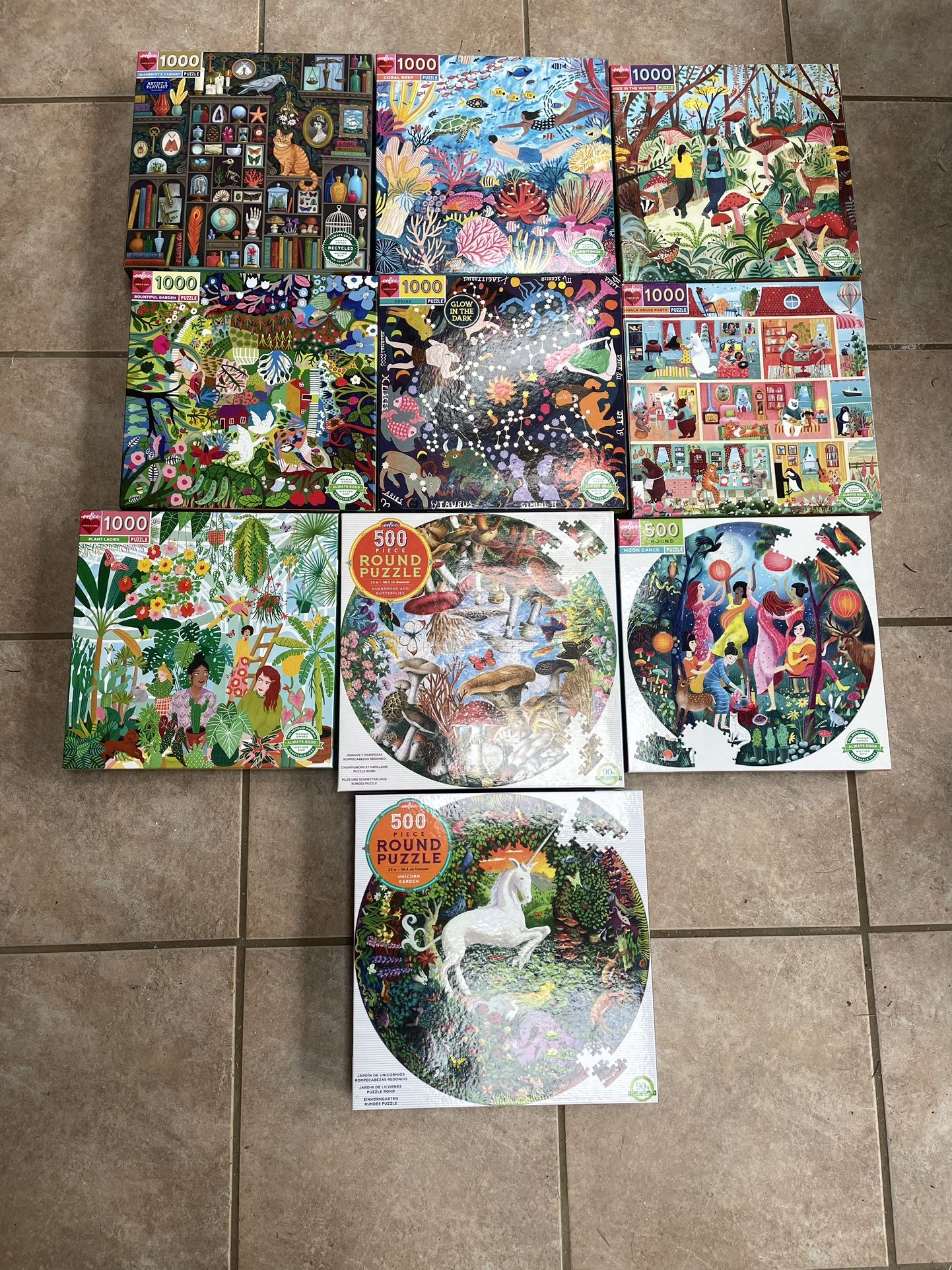 Various 1000 piece and 500 piece puzzles. There is a chance that one piece may be missing from one or two of them. Overall great condition and only done once. These usually go for $25 each. Selling all for $60