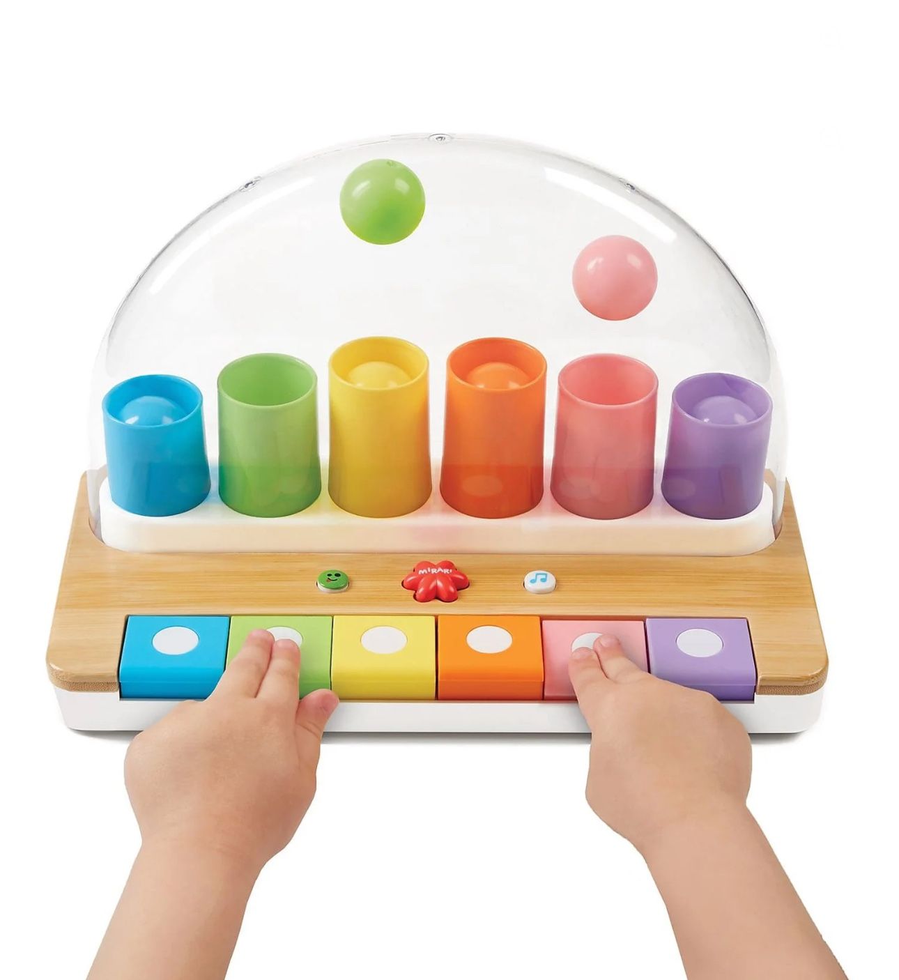 Pop! Pop! Piano -- The Wonder of Making Music! Press the keys to hear a sound and see a ball pop up and bounce! By pushing the buttons on either side of the Mirari logo, The sounds change from classic piano to silly and wacky. The center Mirari button is soft and squishy, and makes a lovable giggle sound when pushed. Piano key colors line up with tube colors for easily learning cause and effect. Measures 9" x 11. 5" x 5. 5"; features a natural wood top on base.