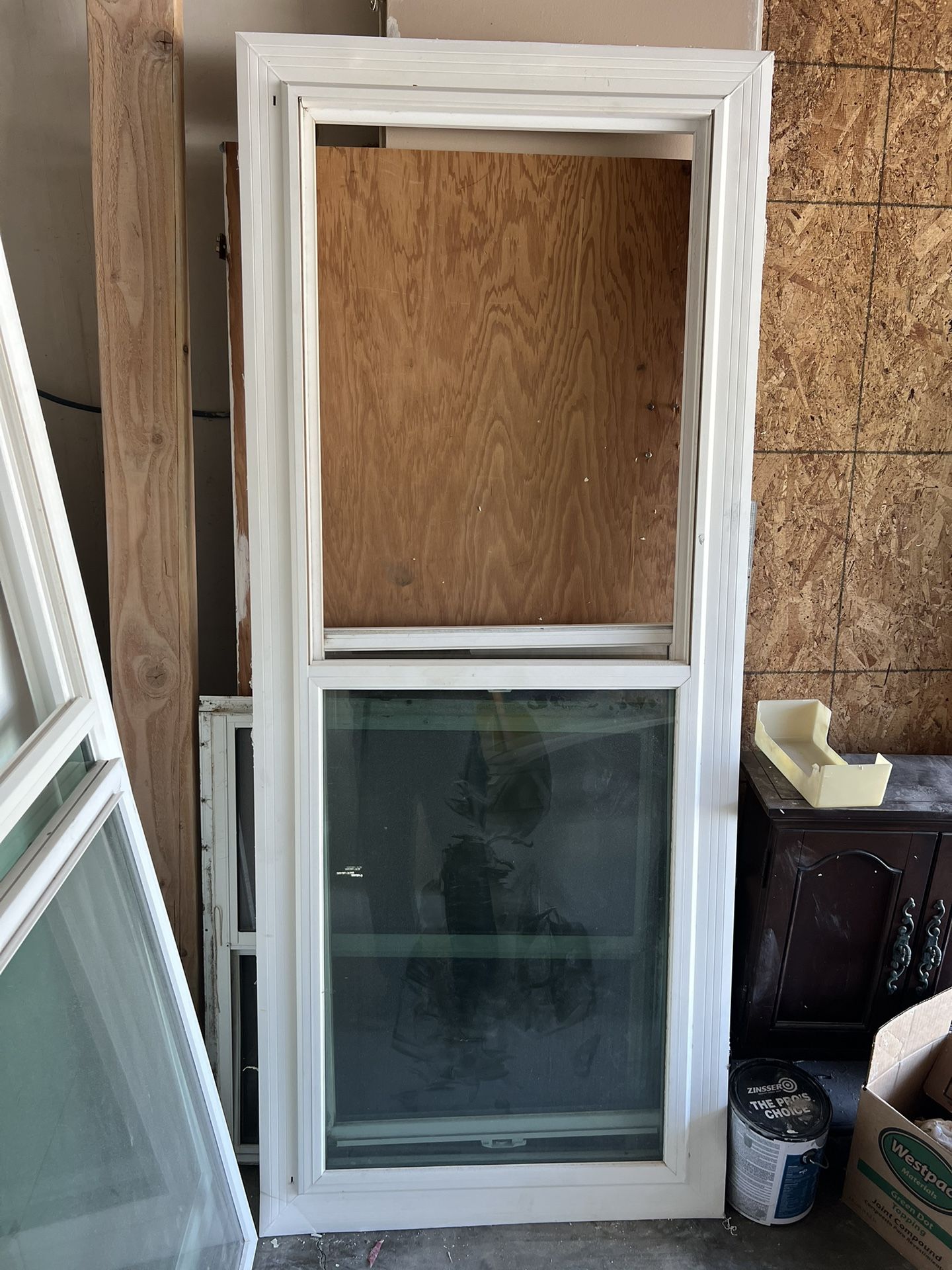 Two vinyl remodeling sliding windows with double glass for energy saving Dimensions: 6 feet wide x 2 feet tall White Price: $120
