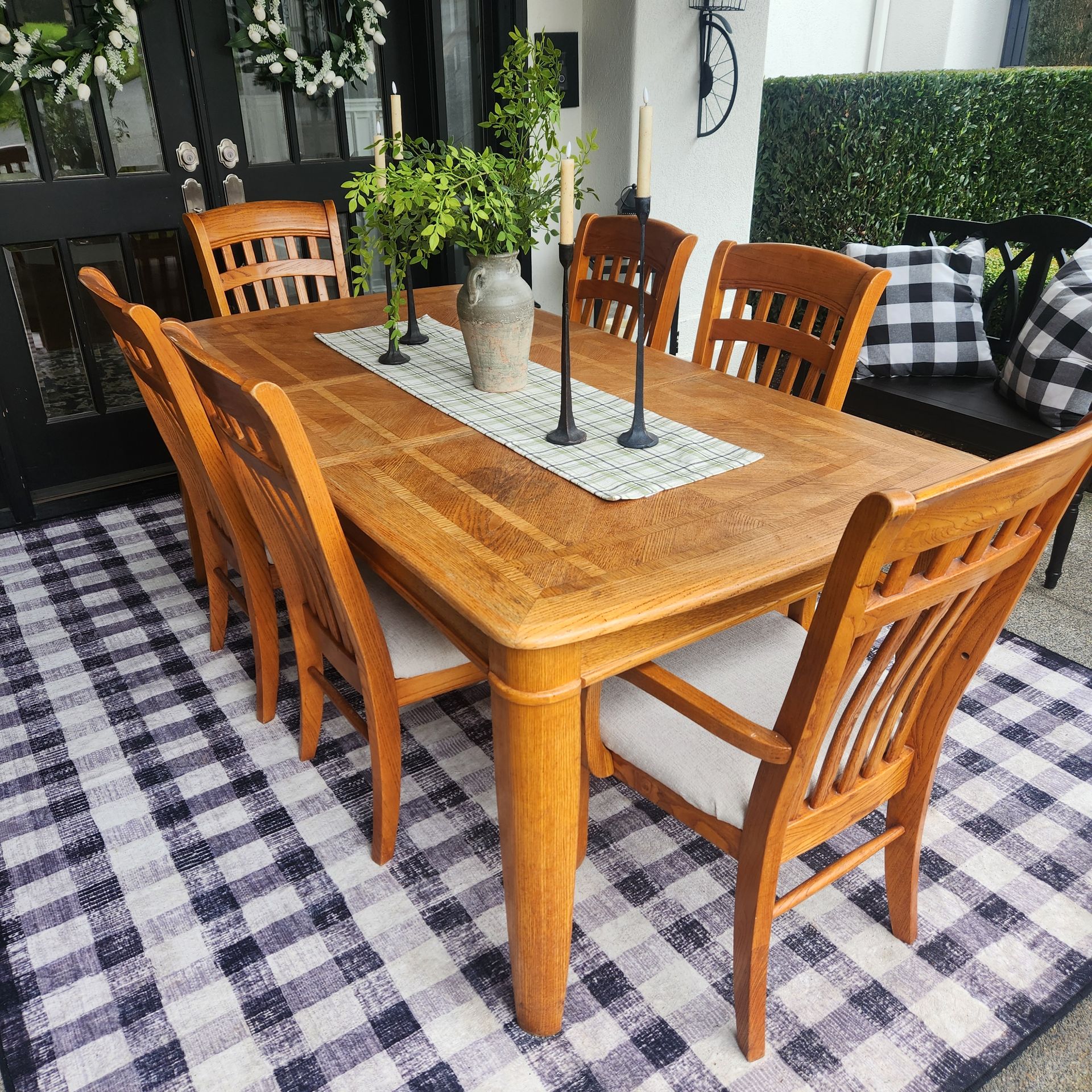 Massive solid wood dining table with an 18" table extension. This GORGEOUS dining table allows 6 adults to enjoy a great meal with family and friends comfortably. All matching 6 chairs have been reupholstered and are STUNNING. No pet damage at all. No smoking home. Table measures without the table extension 60" long, 40" wide and 30" tall. With the 18" table extension the dining table expands to 78" long. Local delivery is available for $35.