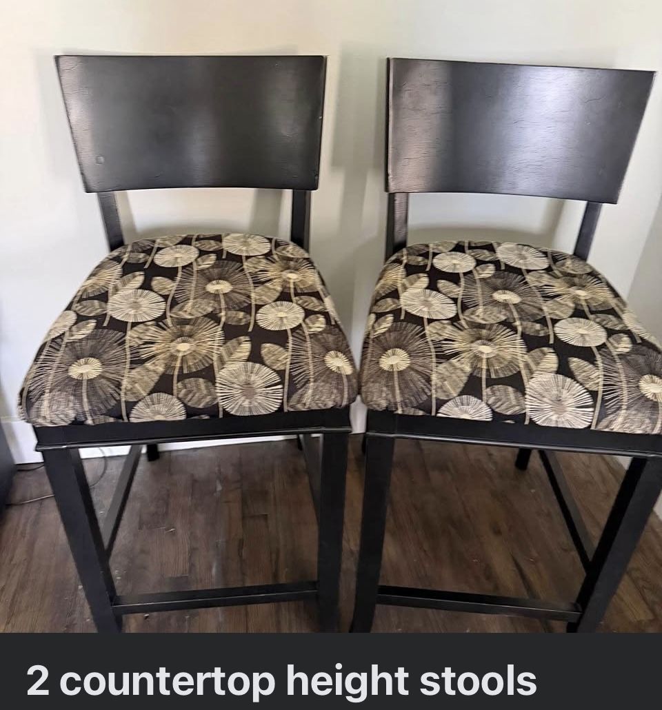 Two Solid Wood Bar Stools With Beautiful Upholstery Design Of Dandelions
