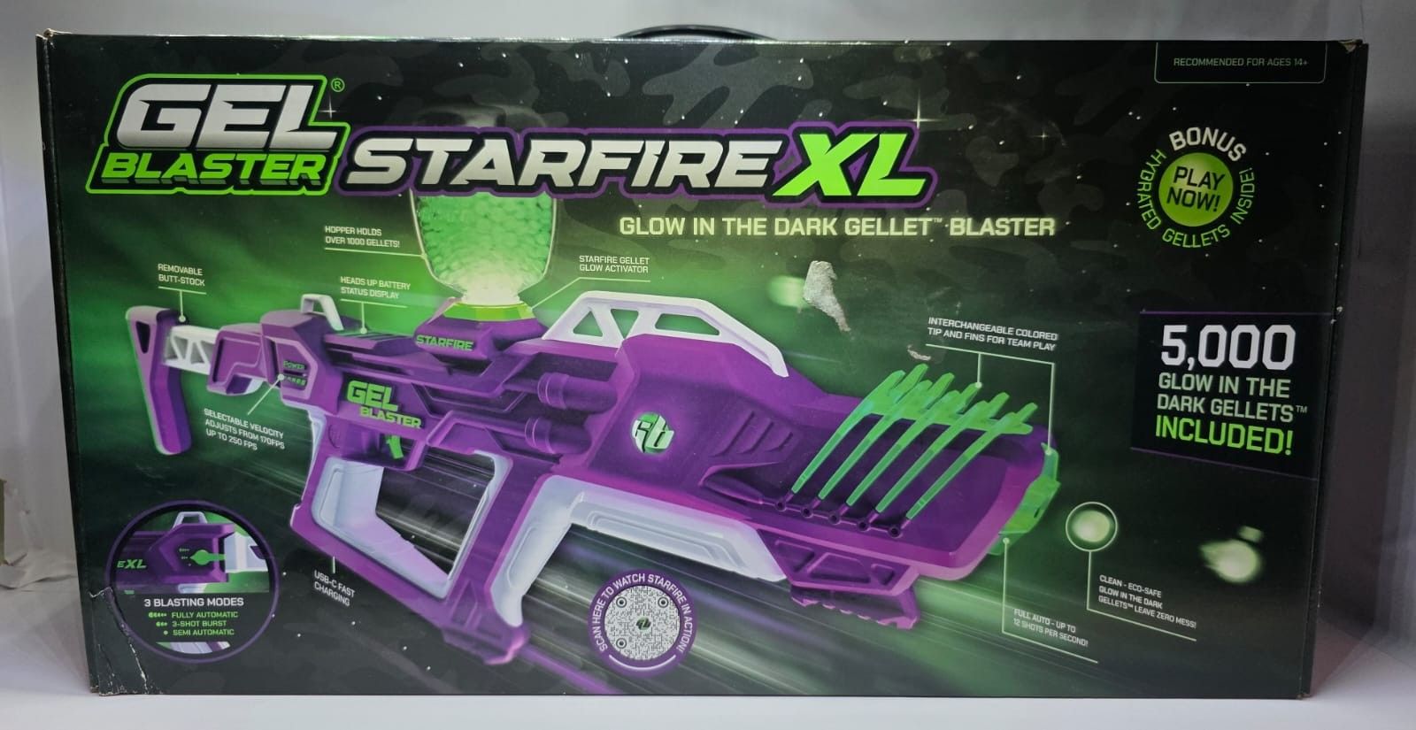 Gel Blaster Starfire XL - Glow-in-The-Dark Supersized Toy Gel Blasters with Water Based Beads - Semi, Full-Auto, Triple Burst + Gel Blaster Gellet Depot - Portable & Collapsible Ammo Storage Tub, Fast Loading Nozzle & Strainer - Hydrates & Stores 10,000 + The Original Supersized Gel Blaster Surge XL - Splat Ball Gun 150+ Foot Range - Toy Gel Blasters with Water Based Beads - Sem Buy all 3: $19989 You might also like Sponsored Product details Top highlights The Biggest, Baddest Gel Blaster for Day & Night: Starfire XL is the ultimate supersized Gel Blaster powerhouse, now designed to transition easily from day to night! Leave the haters in awe as you blast targets 150 feet away at a blazing speed of up to 250 feet per second. Plus, Surge XL’s hopper has a Gellet capacity of more than 1,000, keeping you engaged and your adrenaline pumping around the clock! Activate Starfire & Own the Night: Switch between standard day Gellets to glow-in-the-dark Starfire Gellets with the included LED Starfire Activator. When nighttime rolls around, turn on the activator to infuse Starfire Gellets with UV light and immerse yourself in their captivating glowing tracer effect. Designed exclusively for Gel Blasters, Gellets hydrate in under 4 hours, and ensure pain-free, stain-free fun with no clean-up required. Adjustable Modes to Customize Gameplay: Blast the way you want with three adaptable blasting modes: Single, Triple Burst, or Rapid-Fire Full Auto (10 Gellets per second). With the fully adjustable FPS, you can easily decrease the velocity from 250 to 170 FPS, making it easy to tone down the intensity when playing with less experienced players. Long-Lasting Battery: Starfire XL features a hassle-free built-in battery, providing 4 hours of play on a 45-minute charge via USB-C. It also includes a low battery indicator to signal when it's time to charge up, as well as a lightning-fast charging cable that gets you back in action in half the time. Ready to Blast Day and Night: This kit contains everything you need for your first day to night battle! 1 Starfire XL Blaster, 1 XL hopper preloaded with 1,000 daytime Gellets, 1 Starfire Activator to supercharge Starfire Gellets (2 AAA batteries not included), 1 pack of 5,000 glow-in-the-dark Starfire Gellets, 1 shoulder strap, 1 pair of safety glasses and 1 USB-C charging cable