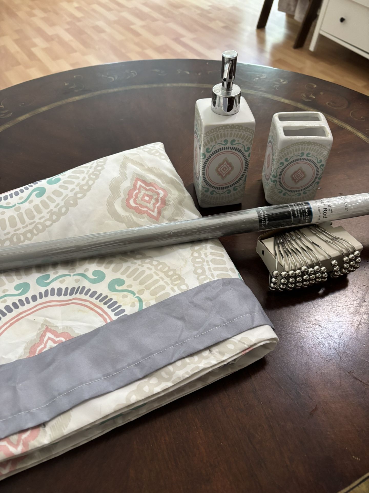 Shower curtain Brand new shower rod Brand new hooks Hand soap dispenser Toothbrush holder