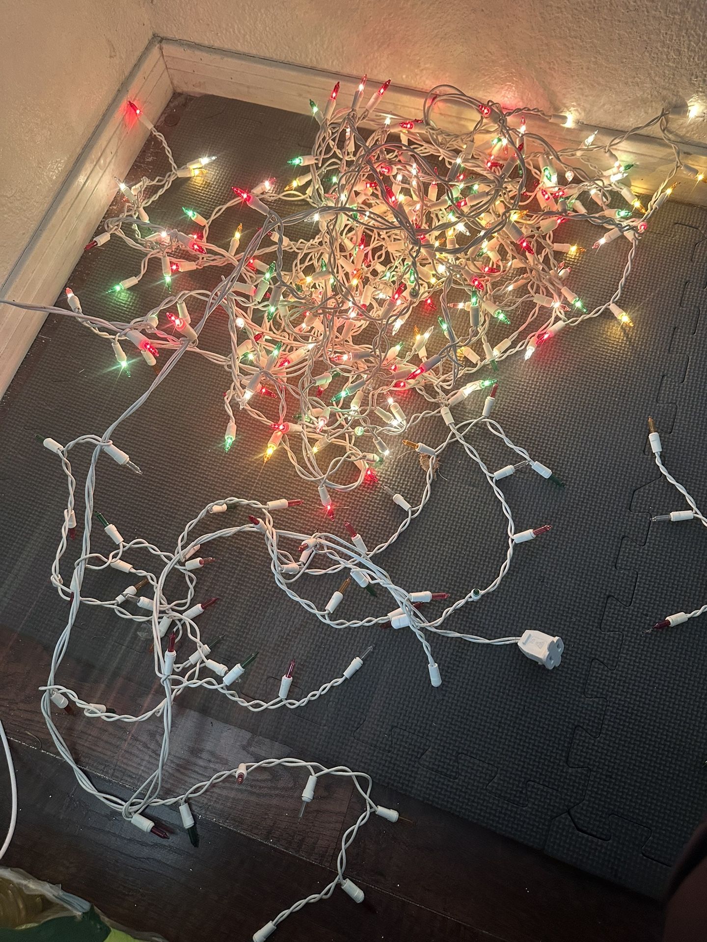 A set of multi color Christmas lights Each connection has lights that don’t turn on. Free for anyone willing to fix them