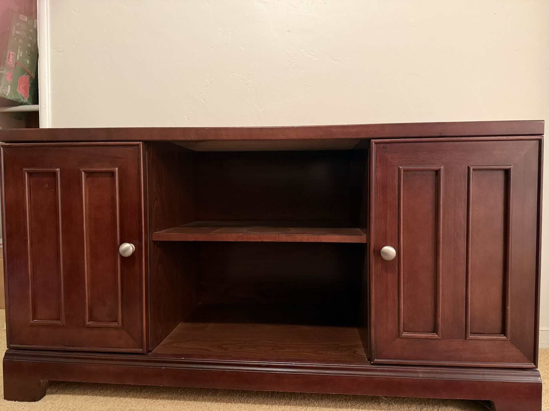 Cherry brown TV console with storage and shelves nice! $50 W 48” H 25.5” D 16.5”