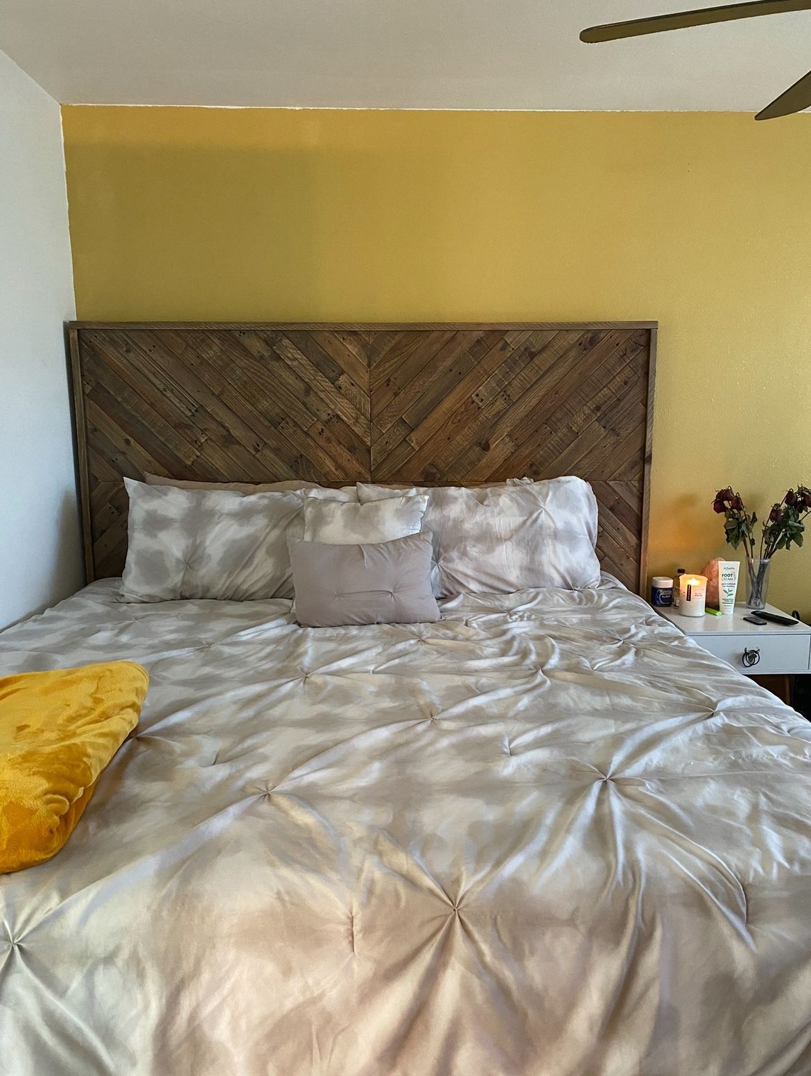 Very nice wood bed frame. Has some chew marks on the right hand side from my dog. We are moving and this is an easy fix for someone. Paid 600 for it.