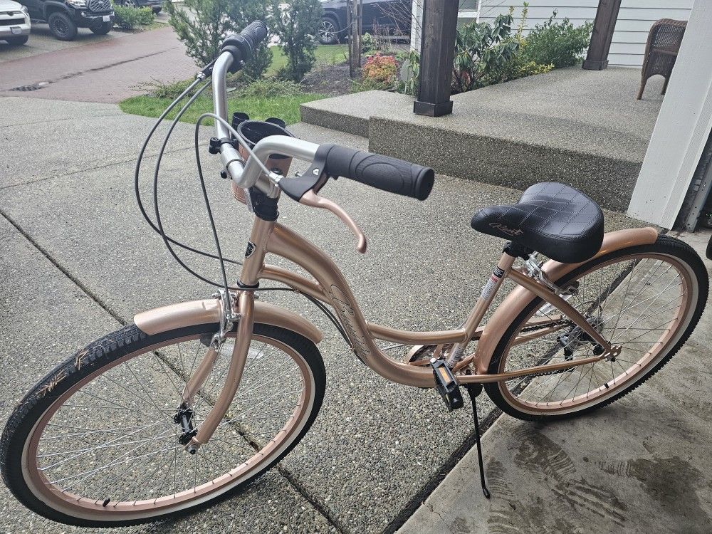Stylish Kent Brighton cruiser bike in rose gold color. Has a comfy seat, fenders, and a handy cup holder. Gears make riding easy. Ready for cruises!