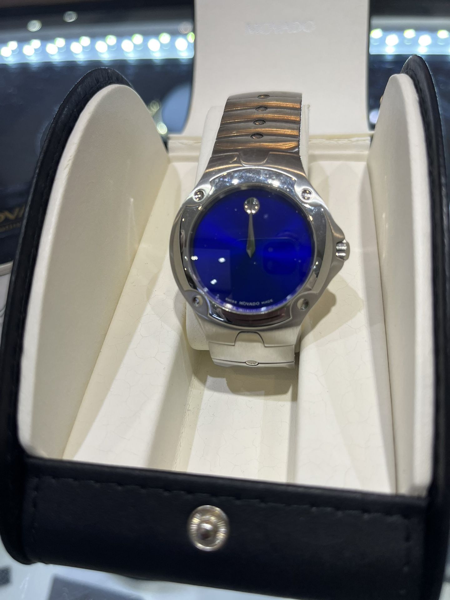 Movado SE watch with a blue dial and a stainless steel bracelet