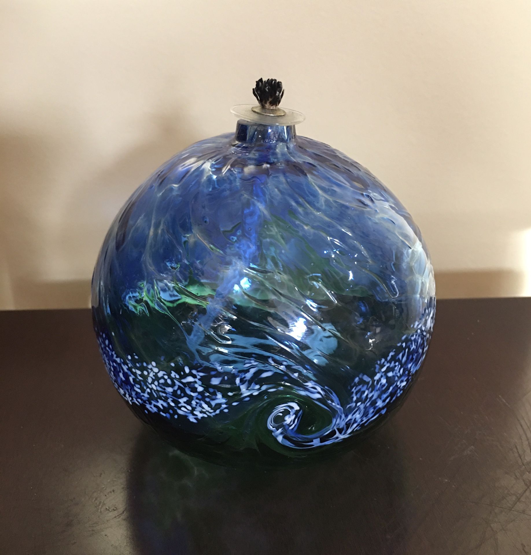 Vintage Hand Blown Pacific Rim Art Glass Iridescent Swirl Sphere Ball Oil Lamp White Iridescent colored swirls on Cobalt Blue and Emerald Green makes it look magical. Add a touch of elegance to your home décor with this beautifully crafted blown glass oil lamp. Its unique design and intricate details make it a stunning addition to any room. Ideal for collectors and those who appreciate the beauty of handcrafted items. This lamp is perfect for adding ambient lighting to any space. The glass base is sturdy and the lamp is easy to refill with oil. Its size makes it versatile and it can be placed on a table or shelf as a decorative piece when not in use. Don't miss out on the chance to own this exquisite blown glass oil lamp.