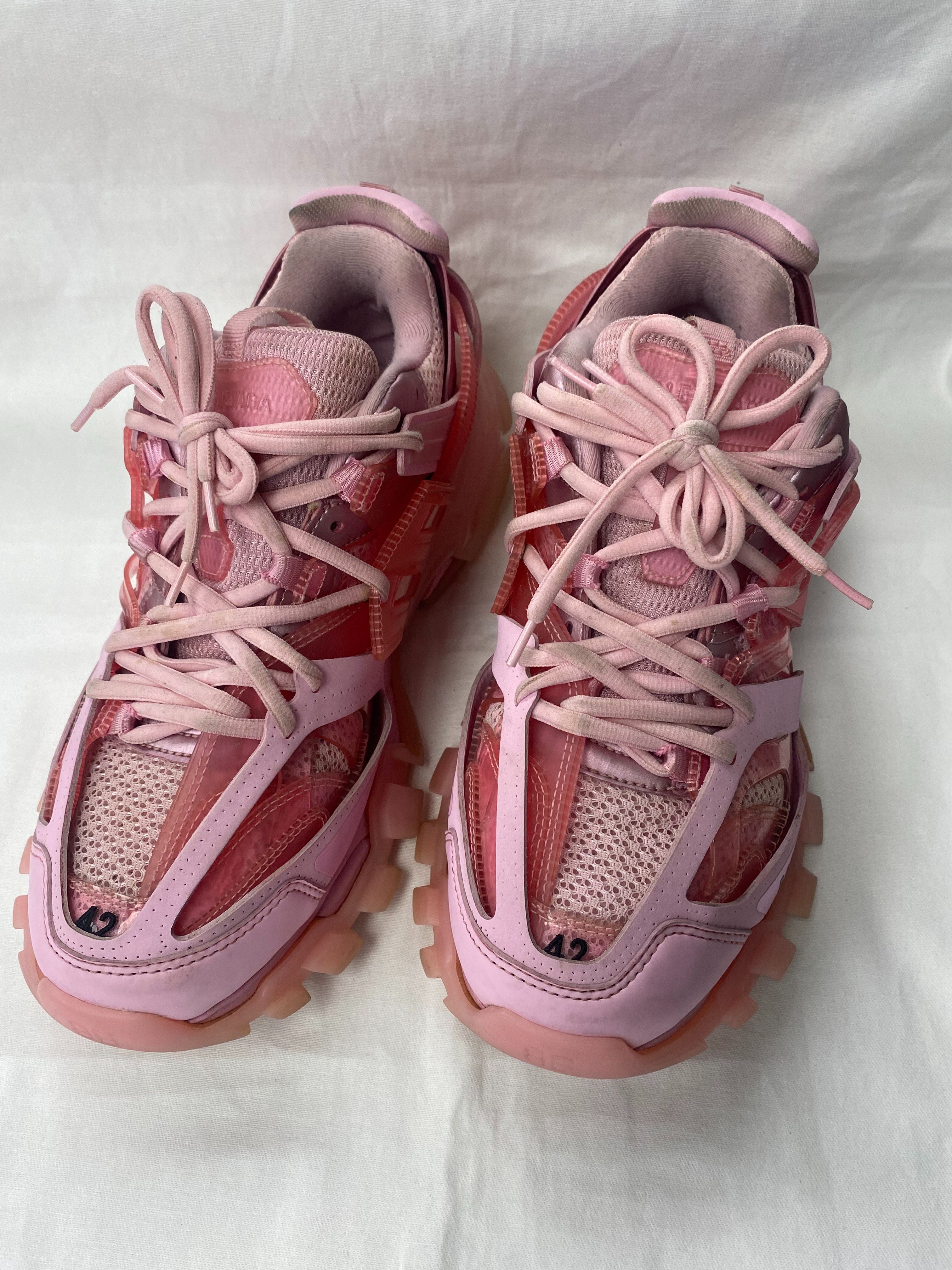 Authentic Balenciaga Track Sneakers in a pink colorway. These are pre-owned / used and show visible signs of wear consistent with normal use. Please review all photos carefully, as they are part of the description. Details Brand: Balenciaga Model: Track Sneakers Color: Pink / Translucent Pink Tones Made in: China Style: Chunky / Fashion Sneakers Authenticity: Guaranteed authentic Size EU: 42 US: 12 (Women’s) UK: 9 JP: 28 Condition Notes (IMPORTANT) Used condition with visible dirt and discoloration on soles Scuffing and wear on uppers, especially around toe areas and edges Mesh shows signs of use Laces show light discoloration from wear Heel and inner padding show wear from normal use No major rips or structural damage noted Shoes only — no box, no dust bags, no extra accessories These are not new and are being sold exactly as shown.