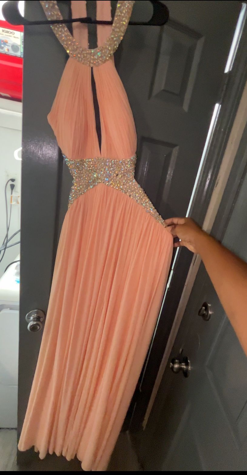 This dress has never been worn and is considered designer. It features two flowing layers for a soft, elegant look and an open back that adds both style and breathability. Perfect for prom or homecoming! If you have any questions, feel free to contact me.