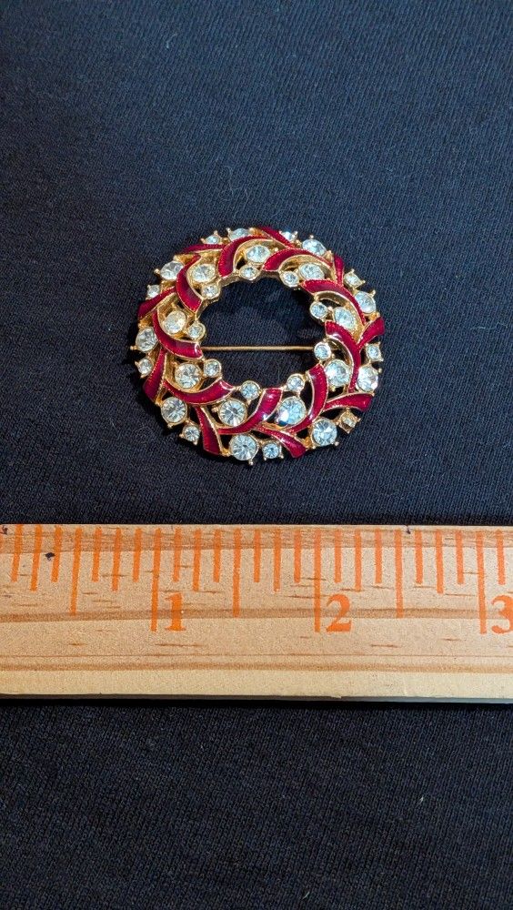Round Red and Gold Enamel Brooch with Clear Glass Stones, 1.75 Inch