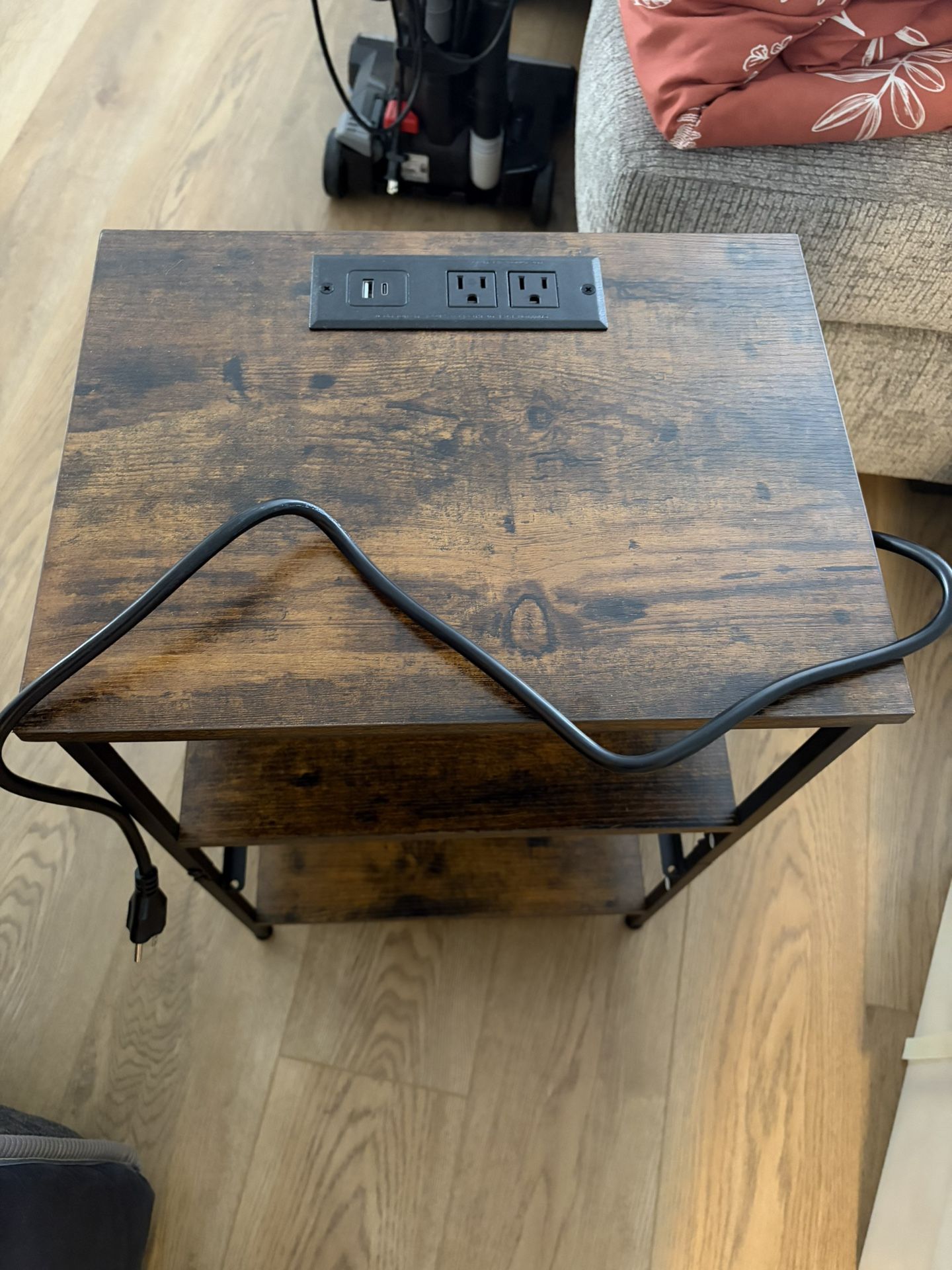 Side table with outlet . 24in tall , about 16in wide.