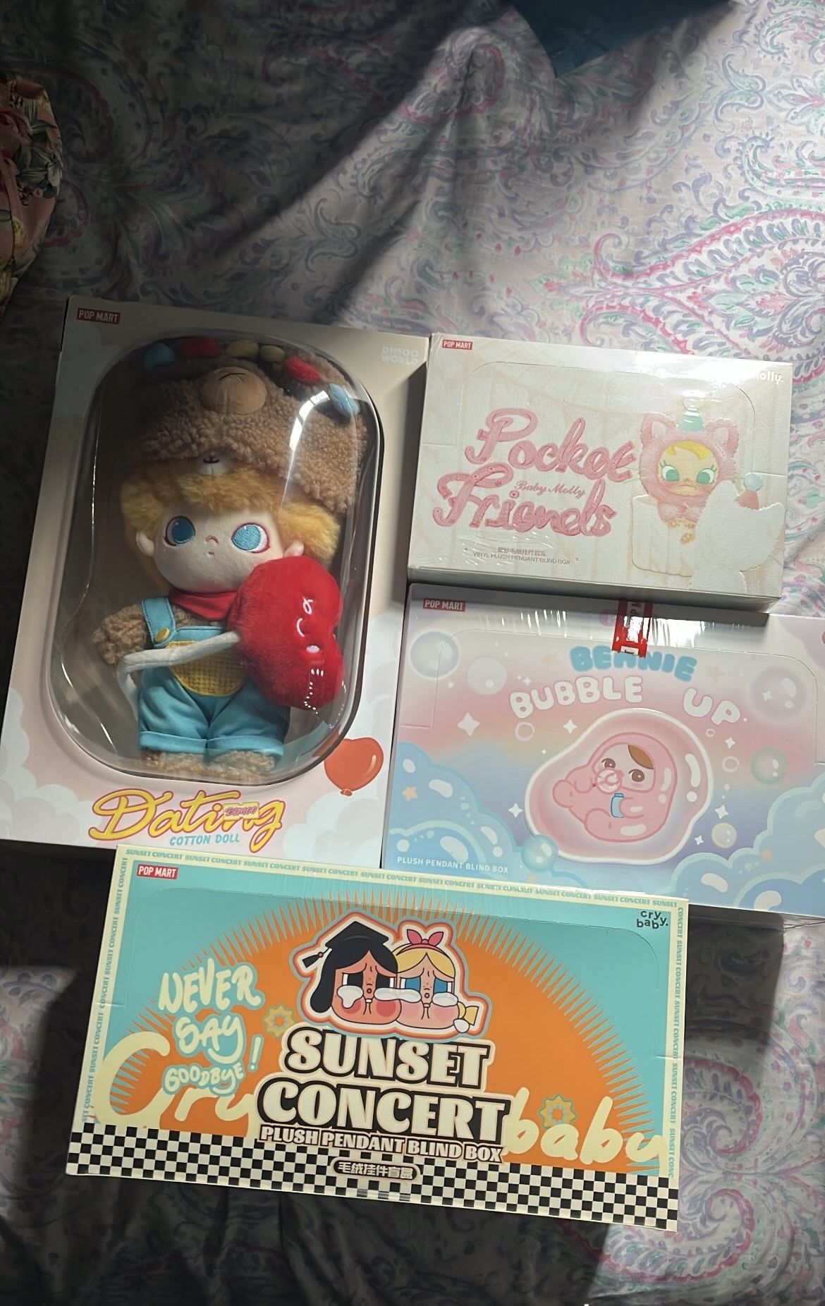 Different sets or individual sales available Pocket Molly - $180 set/ $40 individual Beanie Bubble up - $180 set/ $40 individual Crybaby Sunset - $200 set/ $45 individual Dimoo Dating Cotton Doll - $80 Or Take All for $600