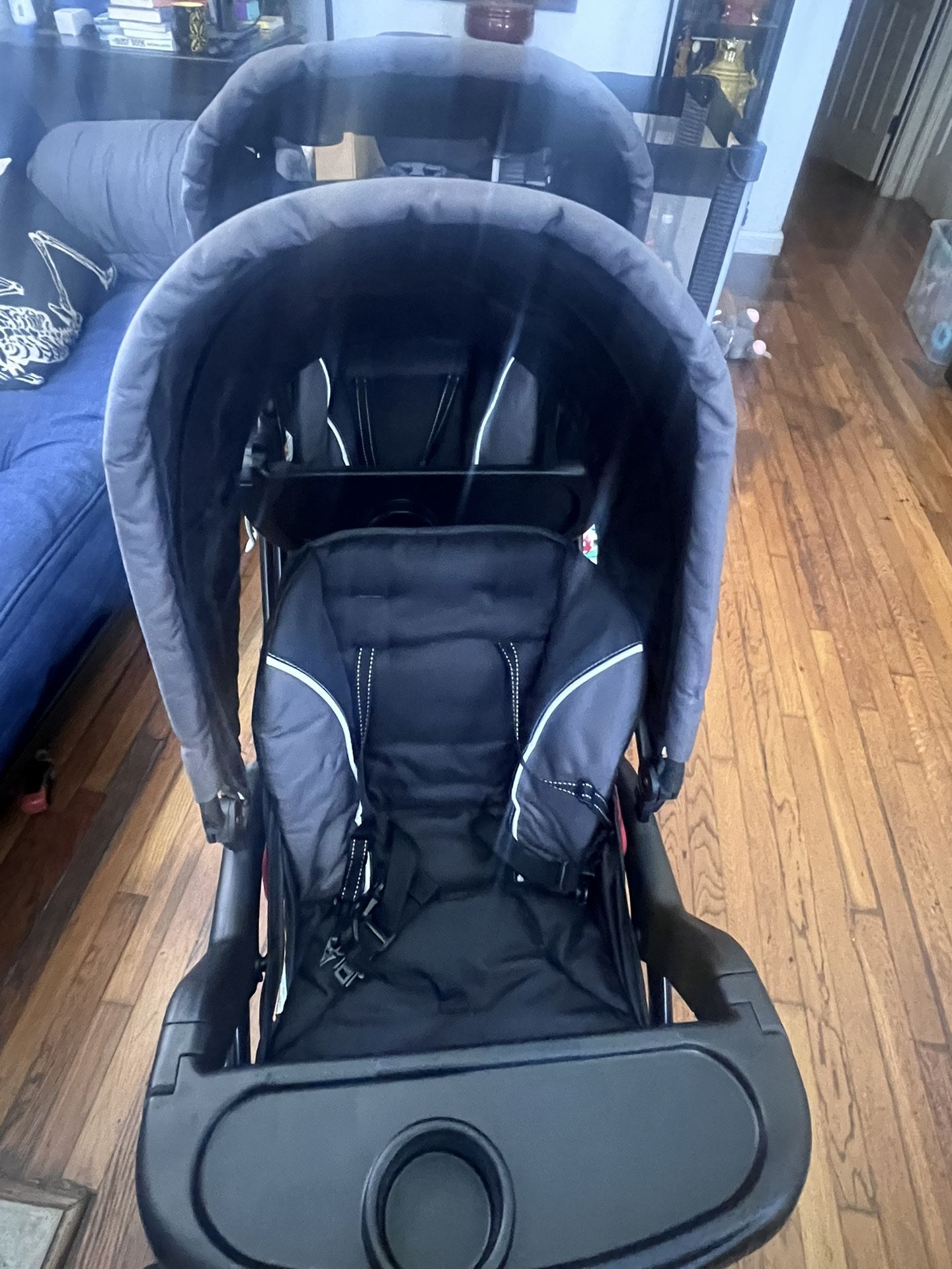 NEVER USED. Was Gifted to me 5 months ago. Baby Trend Double baby stroller. Little stand so a toddler can stand while you stroll. 100 Didn’t fit in my trunk and I never used it.