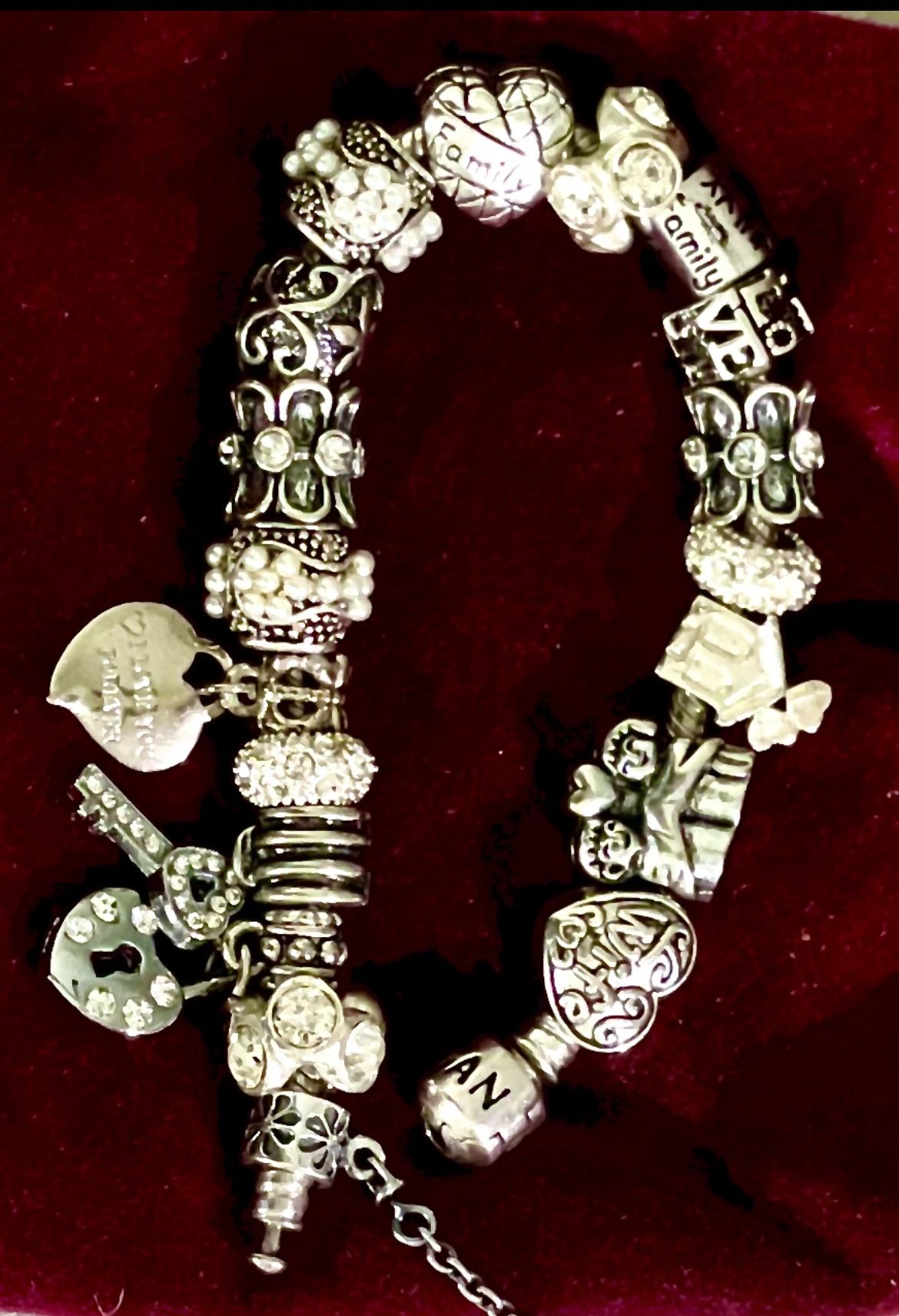 Family/ love themed fully charmed Pandora bracelet with safety chain. Worn once
