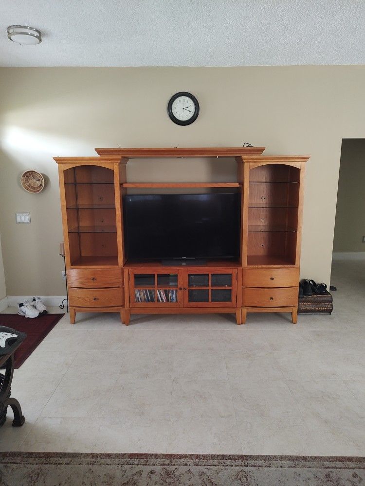 5 piece oak entertainment unit. Unit has 3 lights spread across the top of the unit. The side pieces each have 3 quality glass shelves.
