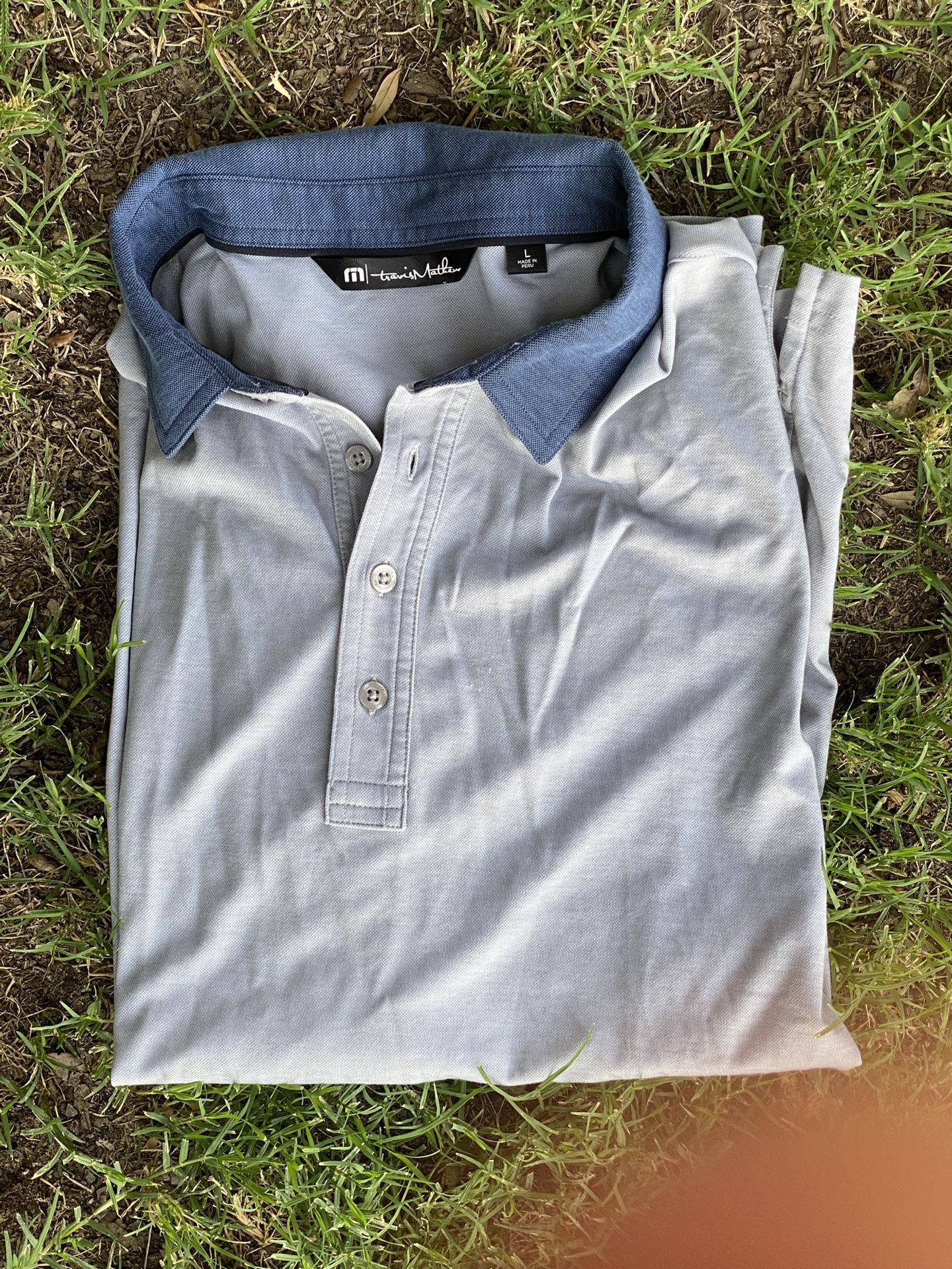 TravisMathew Golf Polo - Large Color: White / Blue Collar Size: Large $25 Travis Mathew Golf Polo golf apparel Travis Matthew’s Travis Matthew Travis Mathew