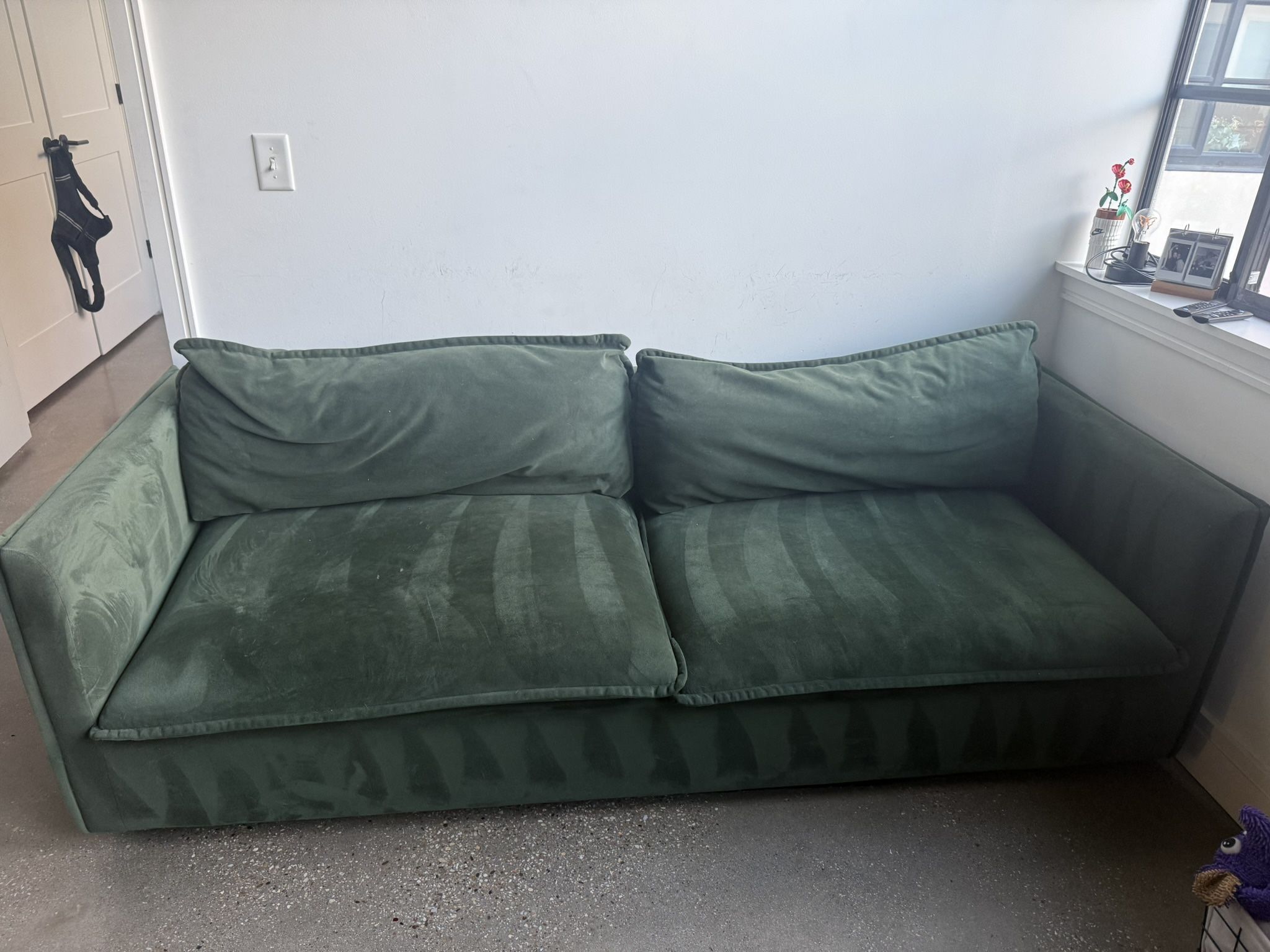There are 4 springs that are broken but can be repaired Other than the springs in great condition, this purchase should be for someone who wants to repair it!! Original cost was a little over $1000 No tears on fabric Velvet material evergreen color Household has two dogs but was cleaned regularly Only had for 2 years!! Couch being sold only (pillows and throw not included)*** Pick up only Purchased directly from West Elm Please see images for photos of damaged springs Couch dimensions: Overall: 86"w x 35.25"d x 32.25"h Seat width: 79.5" Seat depth: 21.75" Seat height: 17.75" Arm height: 26" Back height: 26" Leg height: 2" Diagonal depth: 32.25" Comfortably seats: 3 Product weight: 108 lbs.