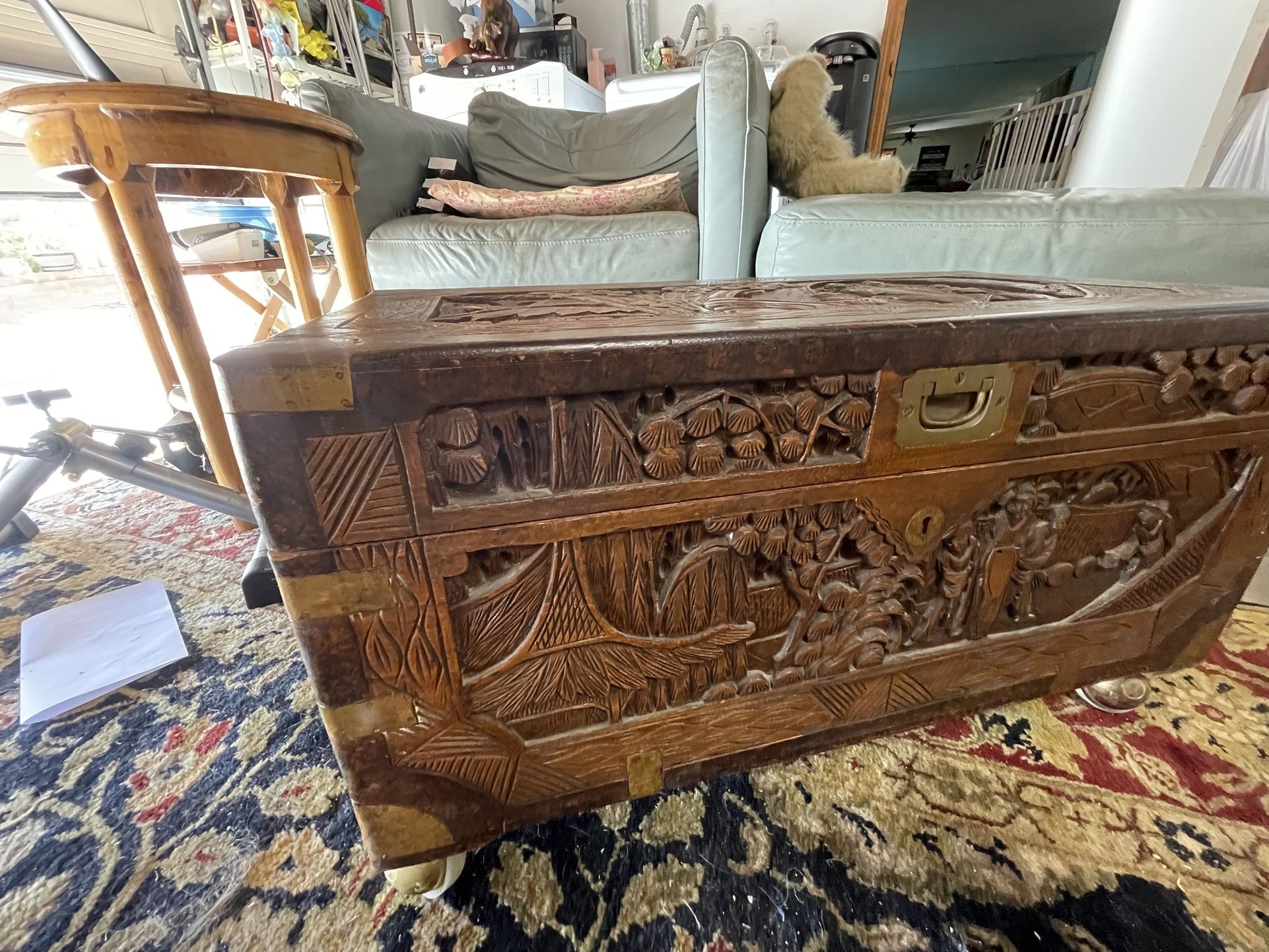 13x29x15 antique unique- carved rare chest like it they sell over $1000 that’s a unique piece lots of great carved details. That’s a fantastic deal- a piece to enjoy.