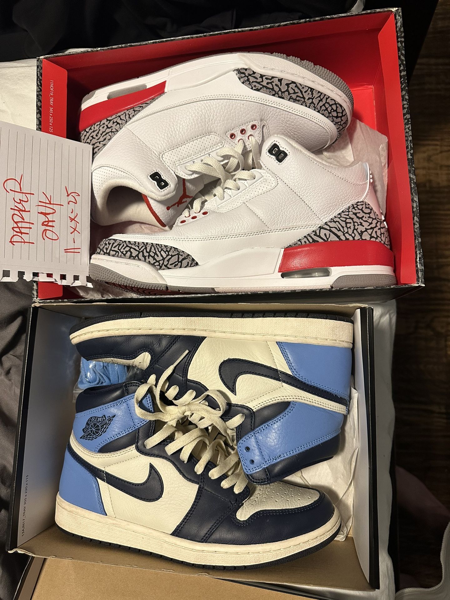 Katrina 3’s Size 11 Super clean could pass as VNDS Og box $180 💵 Obsidian 1’s Sz 8.5 Used but very clean Og all. Box 2 laces and also cream laces $160 💰