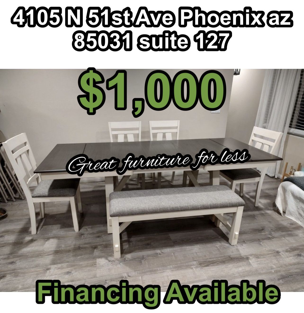 Great furniture for less 4105 N 51st ave phoenix az 85031 suite #127 ☎️ 6️⃣0️⃣2️⃣🧲4️⃣1️⃣9️⃣🧲8️⃣7️⃣5️⃣1️⃣ ☎️ 4️⃣8️⃣0️⃣🧲9️⃣3️⃣0️⃣🧲6️⃣0️⃣7️⃣2️⃣ ✅✅✅FINANCING AVAILABLE ✅✅✅ ⏰Store Hours 10:00 am to 8:00 pm⏰ ✅Bedroom sets ✅impressions vanity ✅bunk beds ✅sectional ✅Dining table sets ✅bed frame ✅sofa and loveseat
