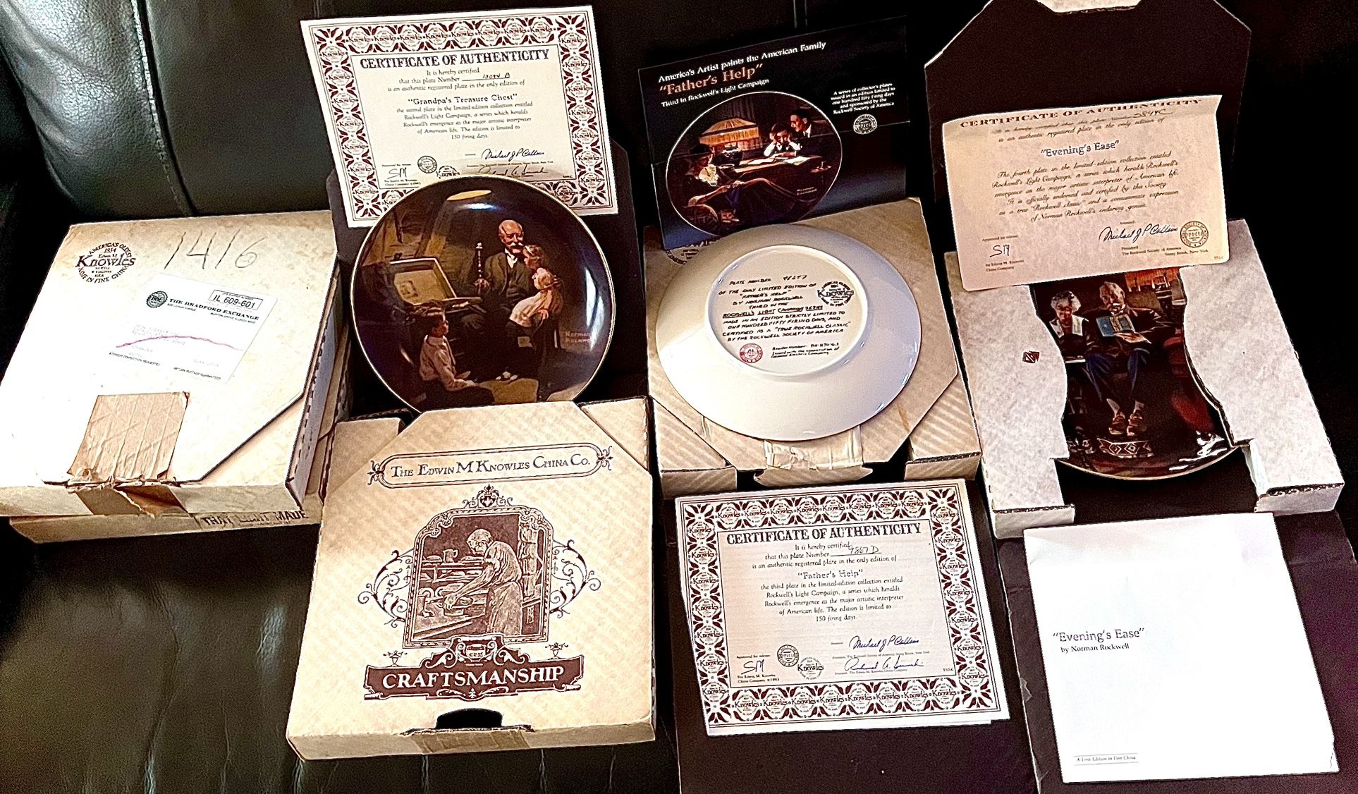 > This listing is for a near-complete lot of 5 out of 6 limited-edition collector plates from the "Rockwell's Light Campaign" series by the Edwin M. Knowles China Company. > Condition: All 5 plates are Brand New in Box (NIB), never displayed, and come with their original Certificates of Authenticity (COA) and descriptive pamphlets. > Plates Included: > * This is the Room That Light Made > * Grandpa's Treasure Chest > * Father's Help > * Evening's Ease > * Close Harmony > (Note: This lot is missing Plate #6, "The Birthday Wish") > Excellent opportunity to get archive-quality plates with all original documentation. Ships securely in original boxes.