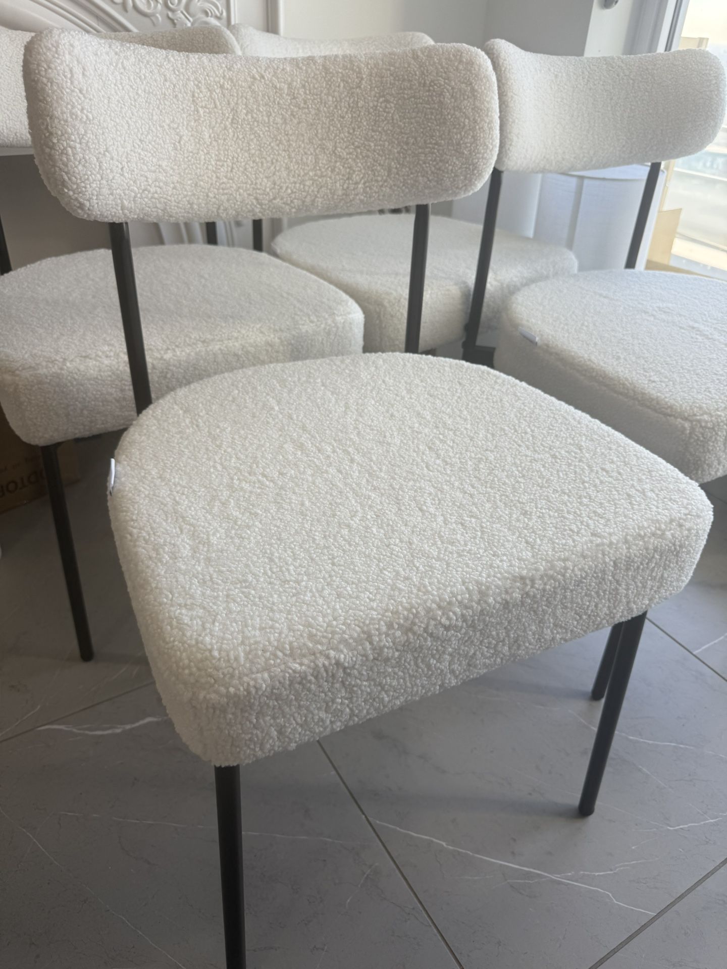 Selling a set of 4 beautiful bouclé chairs – brand new, never used. ✔️ Condition: New ✔️ Quantity: 4 chairs ✔️ Color: White ✔️ Style: Modern / minimal / luxury Bought them 2 weeks ago but ended up not needing them!