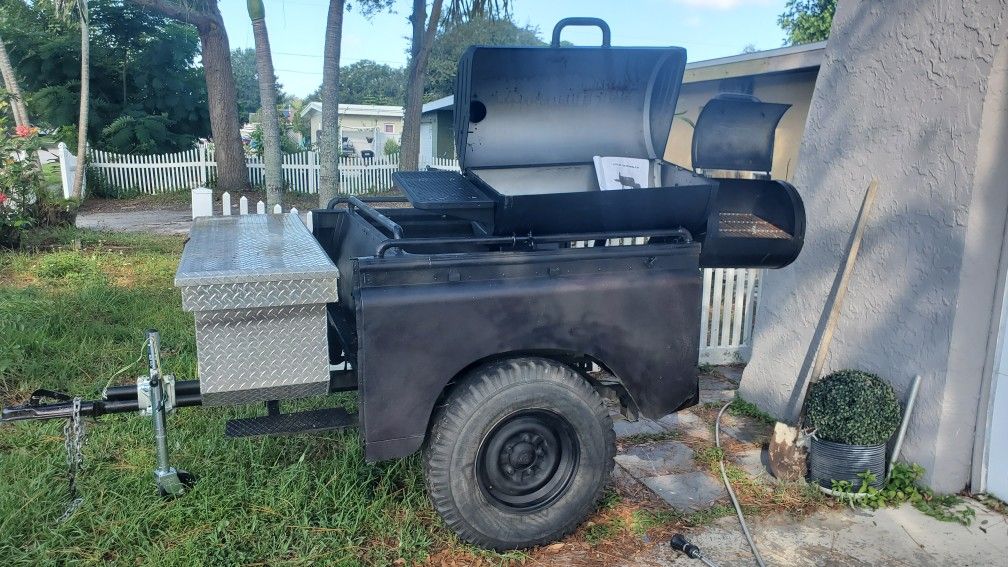land rover trailer with a smoker attached for camping or tailgating