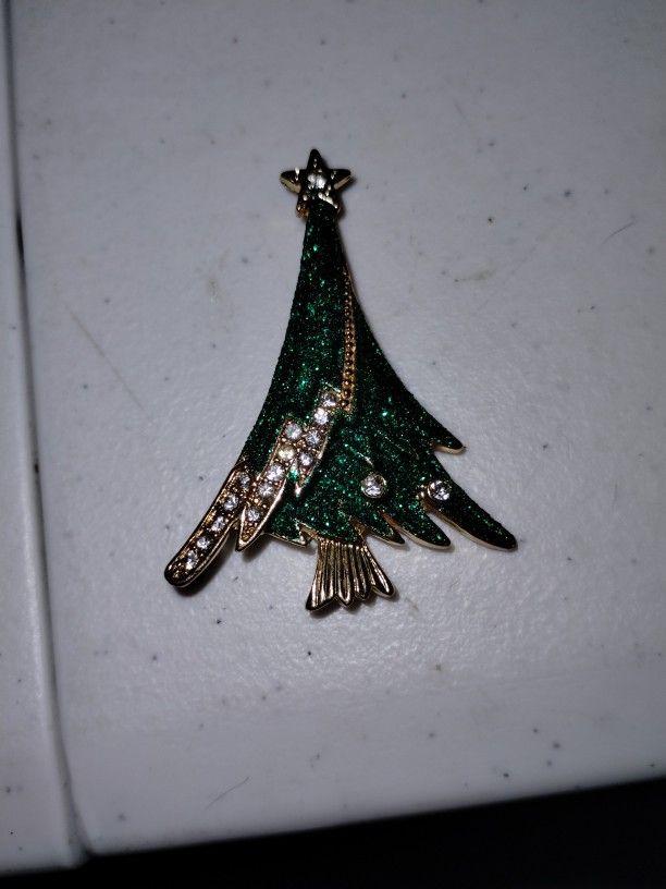 Gold tone - green enamel with rhinestones - 2 inch pin brooch.