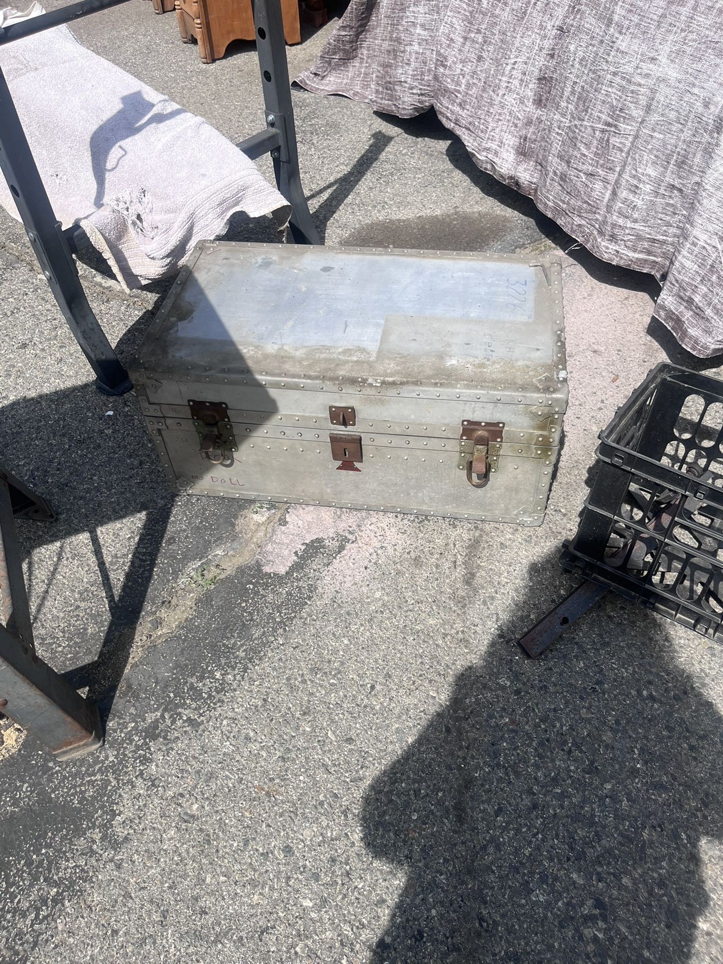 “Vintage metal trunk with original hardware. Great for storage or as a unique coffee table. Solid and sturdy with lots of character.”