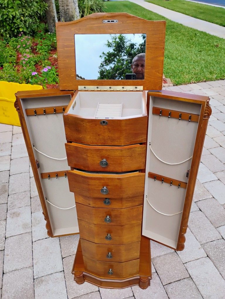 French Design Hives Honey Jewelry Armoire. 40 inch H. With Top Mirror, Pull Out Drawers with Compartment and Fold Out 2 Side Doors