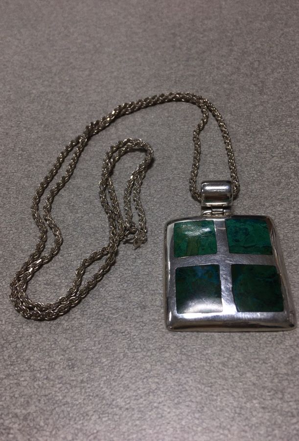 Good condition Sterling Silver necklace and 950 Silver Pendant with green Turquoise inlay.