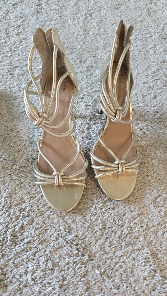 Soft gold women's heels size 7.5. The backs are scuffed and worn.