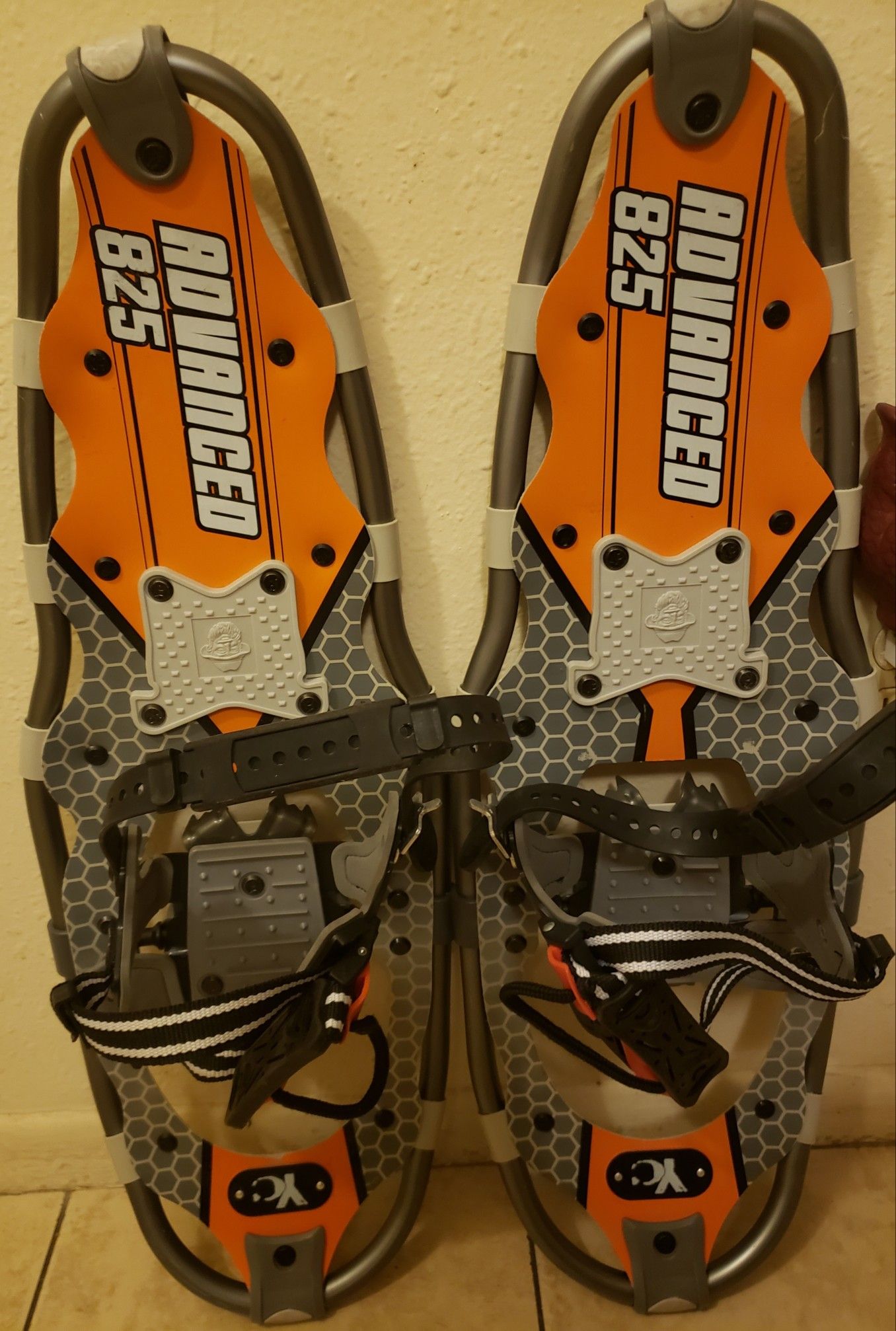 The 80-3002K advanced snowshoe adventure kit includes snowshoes, and travel bag for easy transport. The 80-3002 advanced snowshoe features the Sno-Motion Axle System to alleviate calf strain and make crossing harsh terrain easier to accomplish. The Fast Fit One Pull binding system easily adjusts to most footwear with a glove friendly release, and a rear heel plate to keep your heel centered and alleviate calf strain while ascending. Snowshoe Dimensions: 25" L x 8" W Shoe Weight Limit: 200 lb maximum Frame Material: 6000 Aluminum Crampon System: Powder Coated Forged Steel Frame Color: Orange and Titanium. GOOD CONDITION.