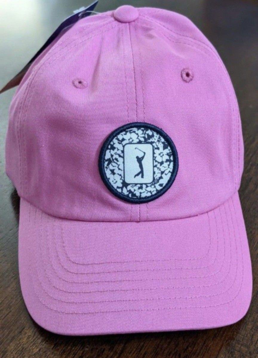Brand New with tag. Pink PGA TOUR Classic Cap. Floral Patch Embroidery. Curved brim to guard eyes from the sun. Washed cotton twill. Moisture wicking band to prevent build up of sweat. Adjustable hook and loop at back.