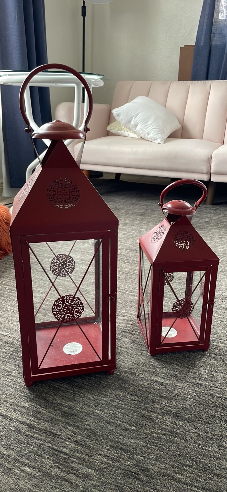 2 lanterns Small 6x6x16” Large 8x8x23 Can be purchase separately Large $30 (intact) Small $20 (small one missing one glass wall)