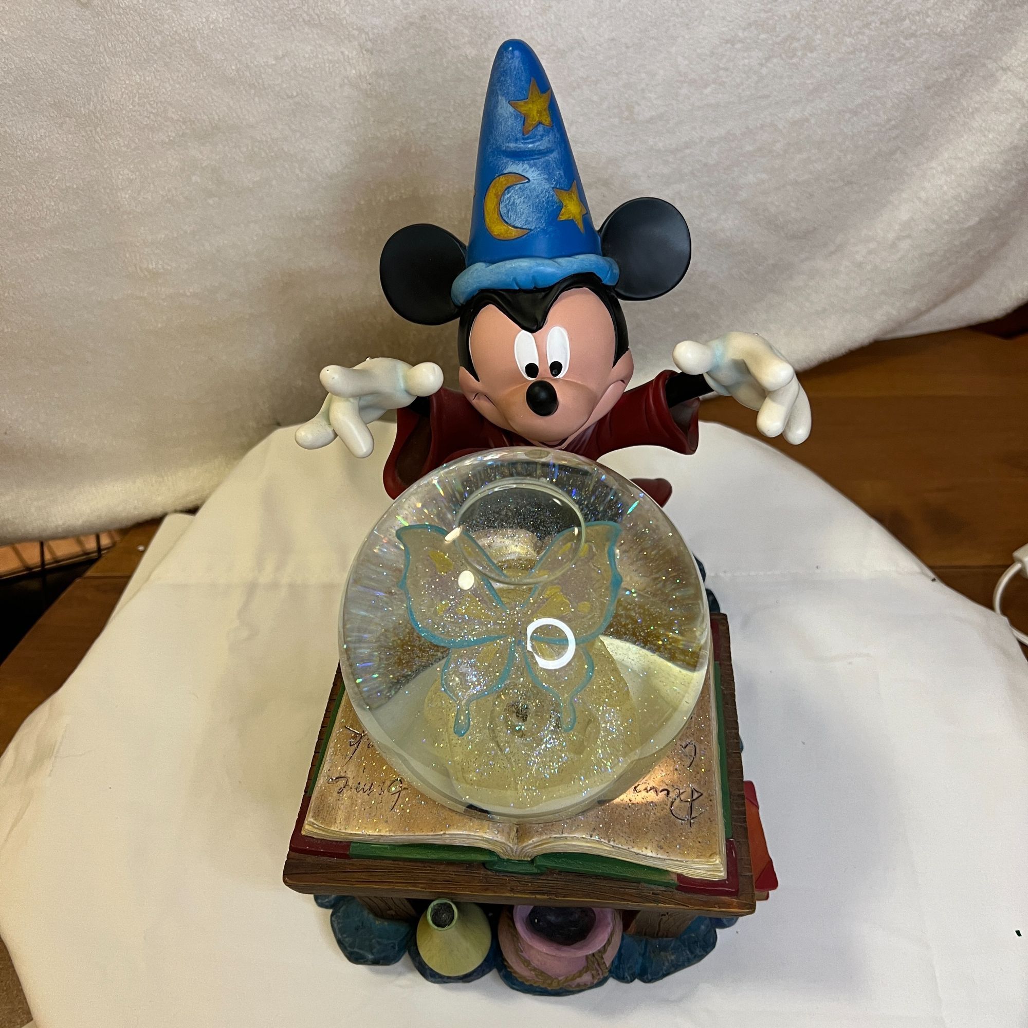 Very large Disney's Sorcerer's Apprentice Snow Globe! This is a Magical, Colorful and Fun Globe. It features Mickey Mouse as the Sorcerer's Apprentice and has a beautiful Butterfly inside the globe. The glitter pump makes the glitter rotate around the inside of the globe, The Butterfly does lights up with beautiful red colors which highlight the butterfly. The music box plays a song called "Sorcerer's Apprentice". The globe measures about 10" L x 7" W x 10" T and weighs about 10 pounds. Original box and form fitting styrofoam case is included This beautiful Disney collectible is a nice piece of Disney memorabilia history. This would make a great gift for any Disney Fan or a great addition to your own Disney memorabilia collection! No holds, first come first served. Price is firm on this beautiful collectible. Pickup is in Centerville Ohio
