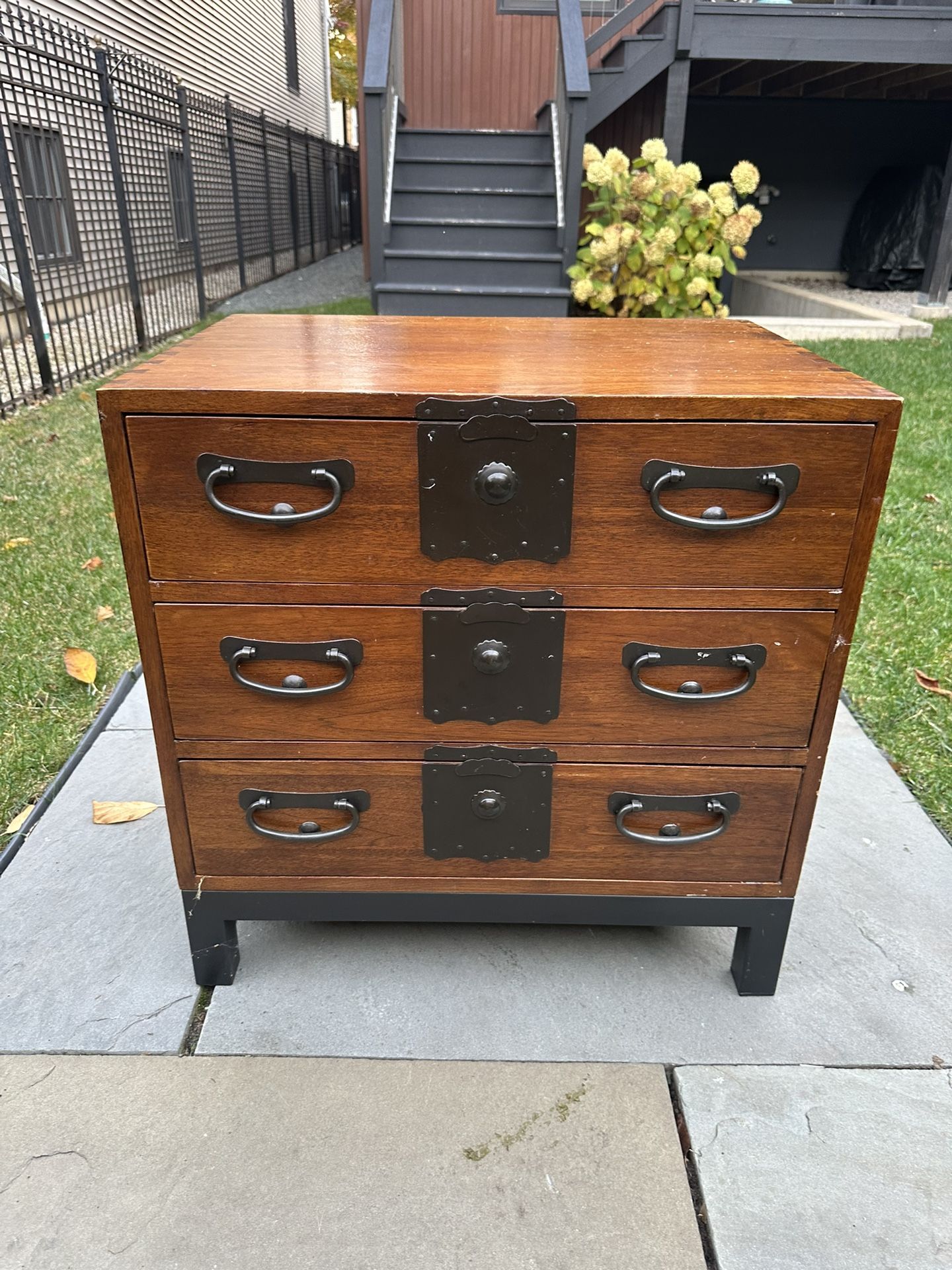 3-drawer wooden chest w/black metal handles. Previously used as a side/end table. Good condition.