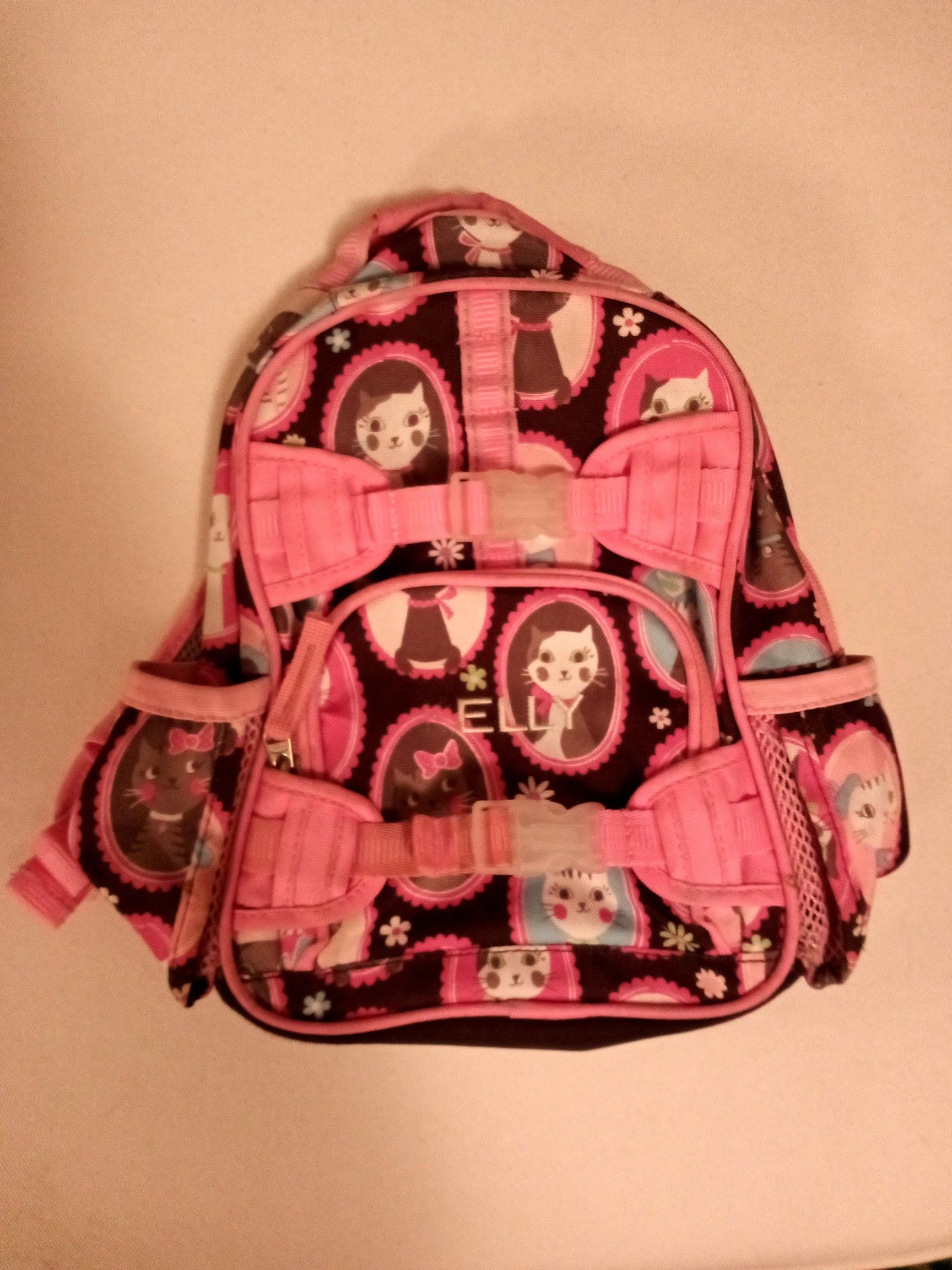 Had the name Kelly on it, I started to remove the name but didn't finish. Daughter used in preschool, has been in storage for awhile and needs a quick wash. No color fading or rips. Zippers work great.