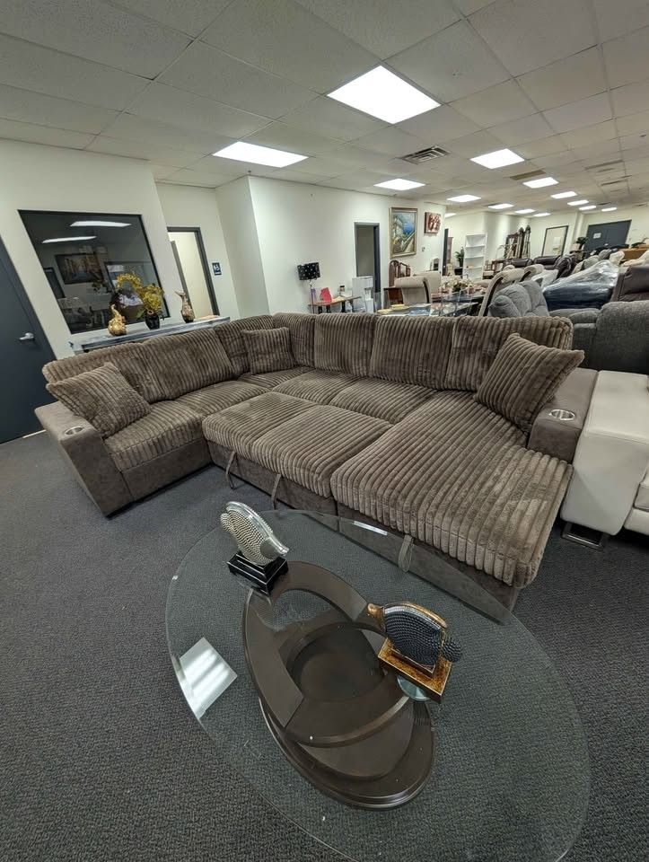 Oversized Brown Corduroy Fur Fabric Sofabed Sectional with Storage, Phone Charger, Fold down table & Cup holders. Very comfortable. Great for apartments & townhomes. Same Day Delivery