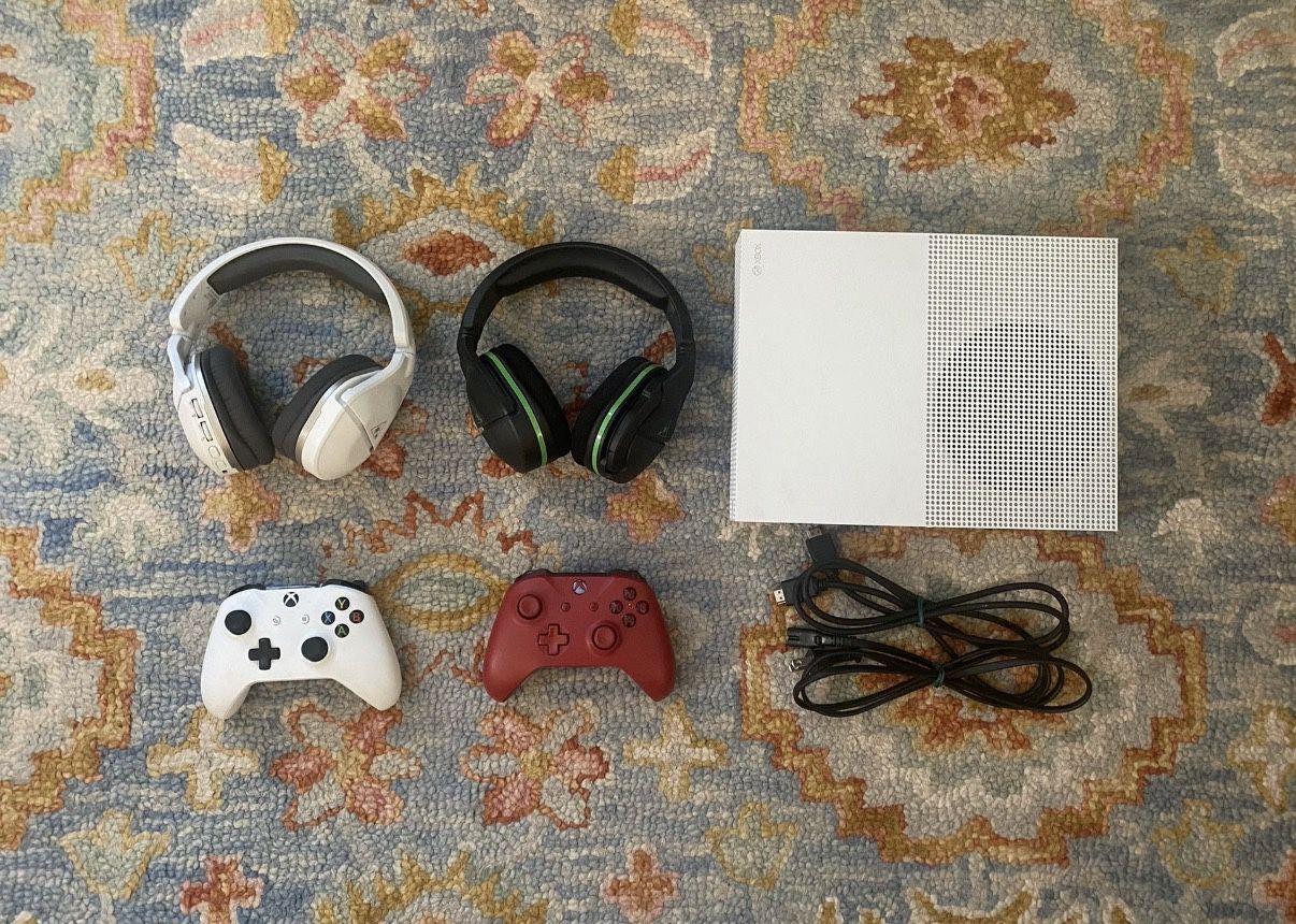 This bundle includes: • Xbox One S (Model 1681) lightly used in great condition • Power cord and HDMI cord • 2 Controllers (no charging cord) batteries included • 2 Turtle Beach Headsets (Gen 2 S600) with charging cord and instructions • Tony Hawk’s Pro Skater 5