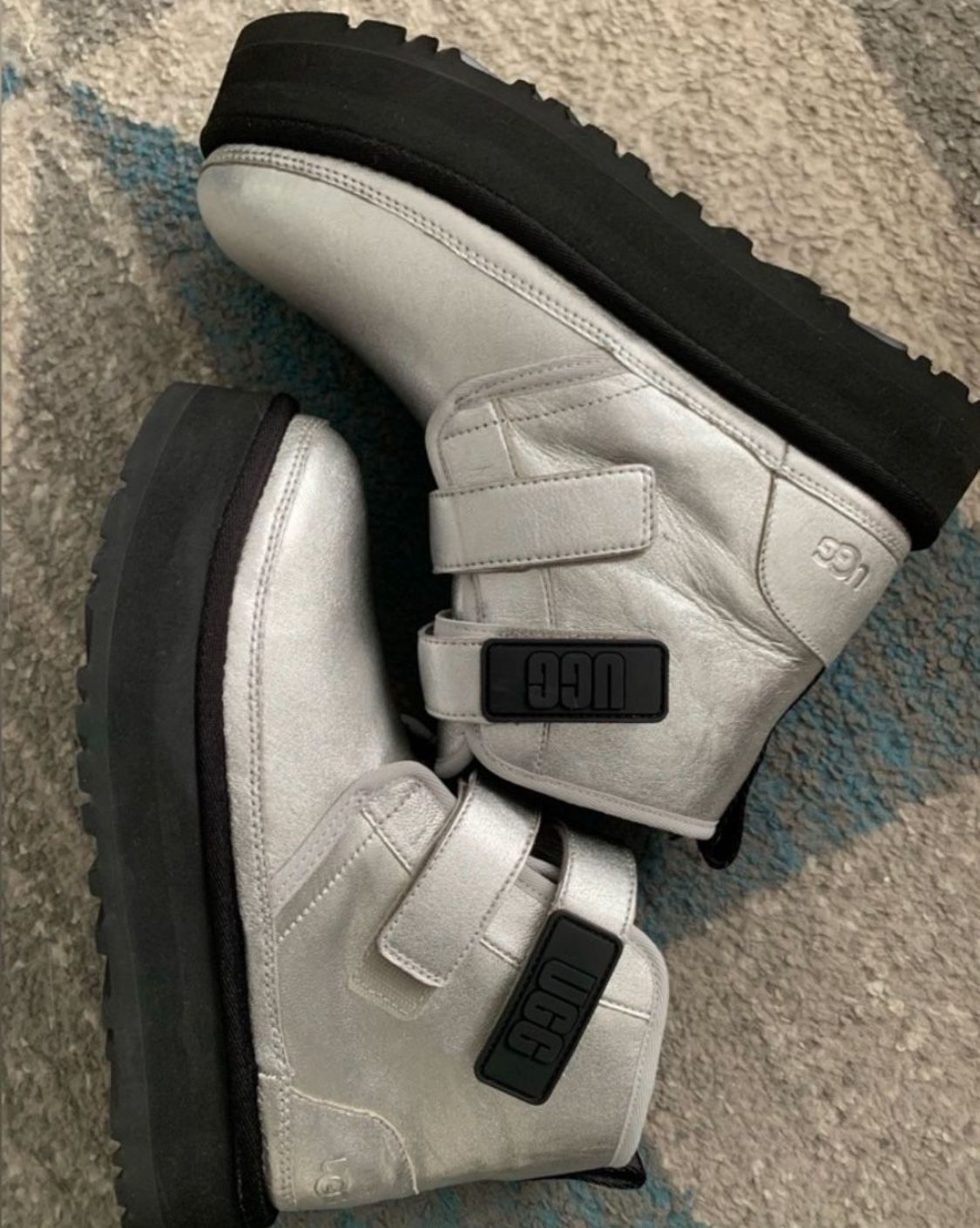 Brand new UGG platform Big Girls size 6 ( Can fit women’s size 7-7.5) Velcro straps for easy on off Metallic silver color