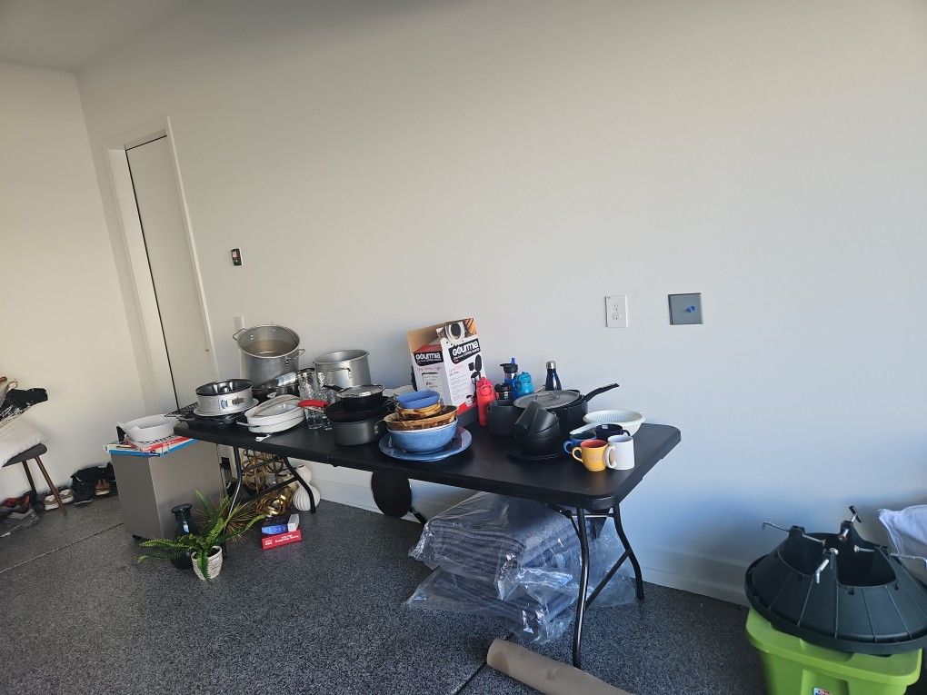 Pots, pans, small coffee maker, wooden salad bowl set, dishes, pyrex, etc