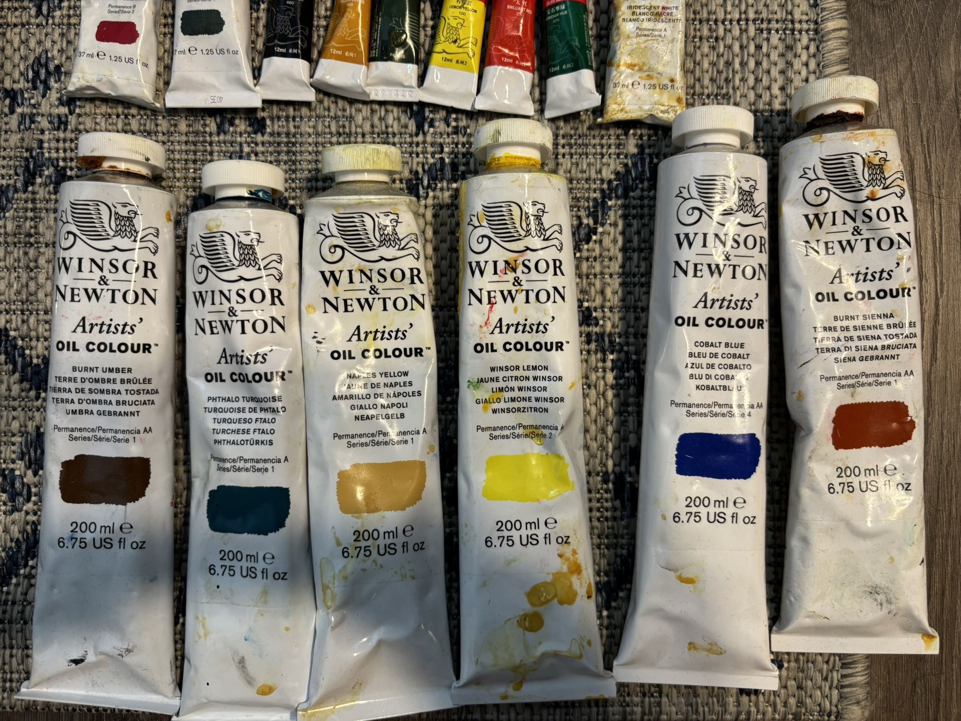 Partially used or new! 6.75 US fl oz Naples Yellow $15 6.75 US fl oz Winsor Lemon $15 6.75 US fl oz Burnt Sienna $15 6.75 US fl oz Cobalt Blue $30 6.75 US fl oz Phthalo Turquoise $15 6.75 US fl oz Burnt Umber $15