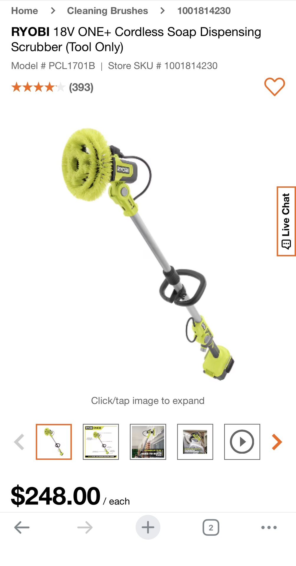 NEW Ryobi 18V ONE+ Cordless Soap Dispensing Telescoping Scrubber (Tool Only)